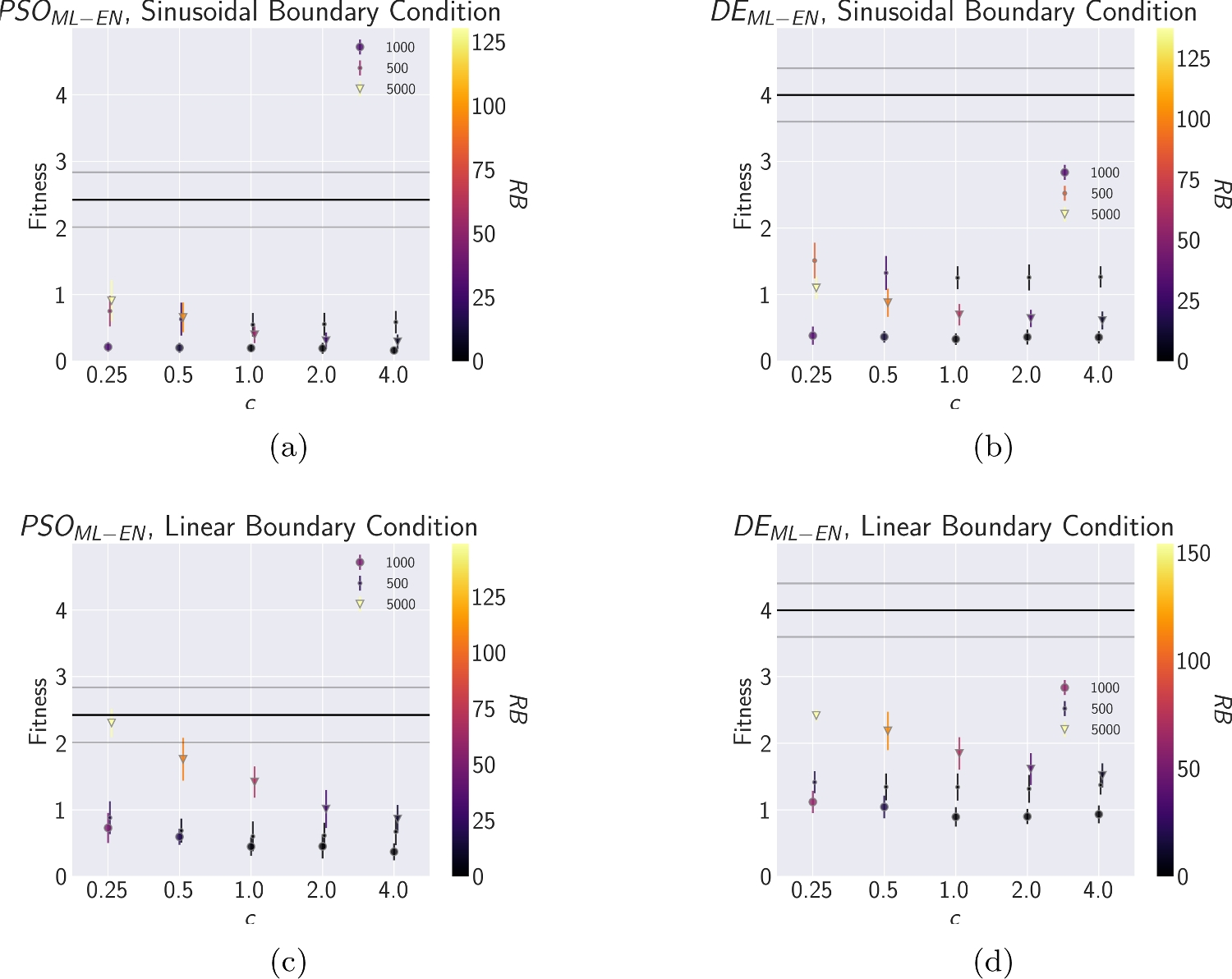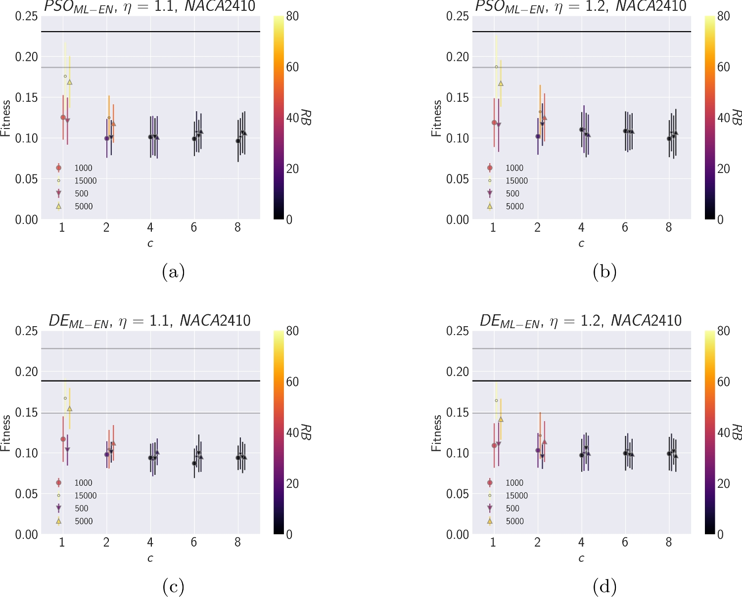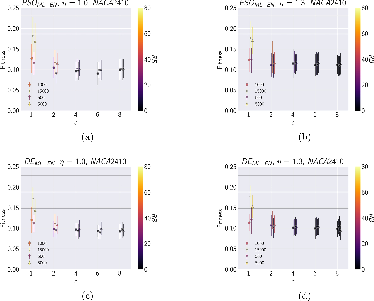 Results from the ML-enhanced framework for NACA2410 include the following boundary refinement configurations: (a) \(PSO_{ML-EN}\), \(\eta\) = 1.1 (b) \(PSO_{ML-EN}\), \(\eta\) = 1.2 (c) \(DE_{ML-EN}\), \(\eta\) = 1.1 (d) \(DE_{ML-EN}\), \(\eta\) = 1.2. The markers denote the different dataset sizes used to train the ML model, while the coloring of the markers represents the remaining simulation budget (RB) values. A higher RB signifies greater savings in the computational budget, while low fitness values imply a better approximation of the target performance. The markers are slightly offset for each c value to improve visibility