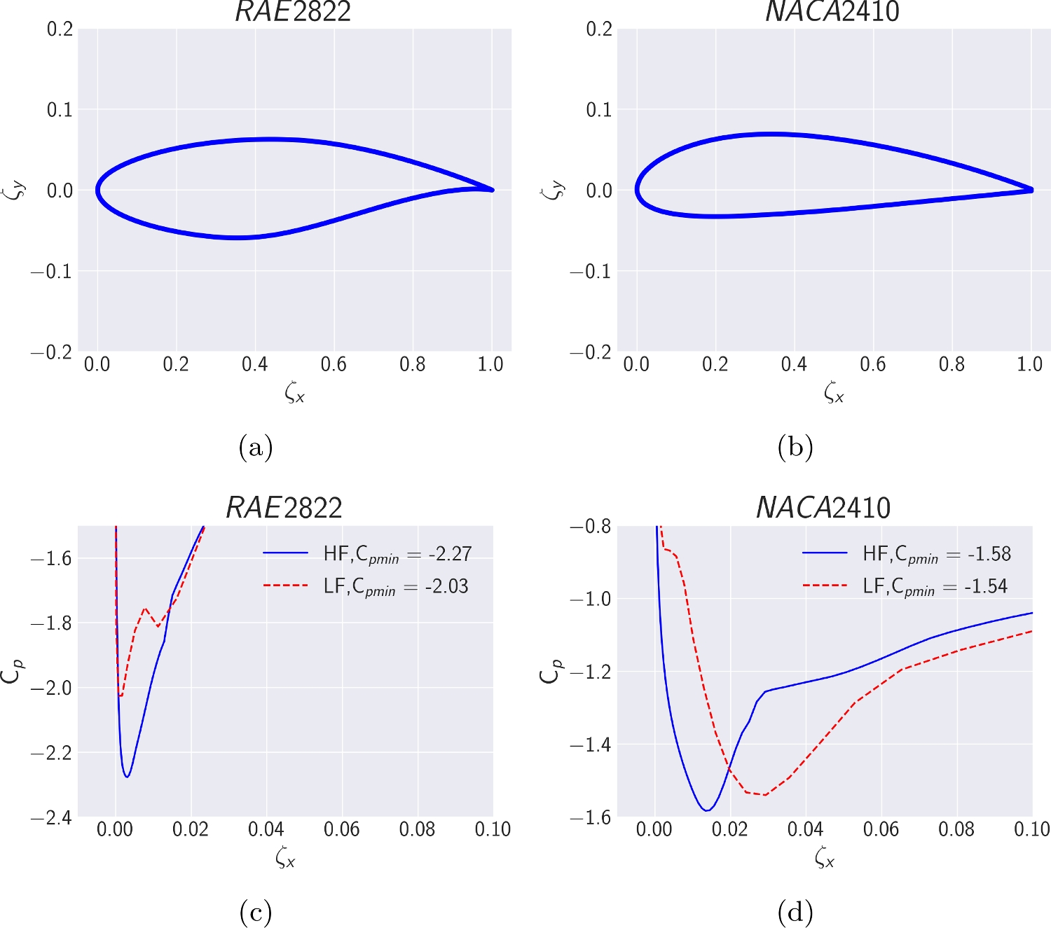 \(\textbf{C}_{p}^{C}(\textbf{x}) \in \mathbb {R}^q\) denotes the computed pressure distribution around an airfoil based on the design vector \(\textbf{x}\), while \(\textbf{C}_{p}^{T} \in \mathbb {R}^q\) signifies the user-defined target pressure coefficient distribution measured at the same locations on the surface of the airfoil. For all target cases, \(q = 300\). For each evaluation of \(\textbf{x} \in \mathbb {R}^{N_c}\), the computed pressure distribution \(\textbf{C}_{p}^{C}(\textbf{x})\) is linearly interpolated to match the target pressure distribution in both the size and airfoil surface location for each individual component q. \(C^T_{p_{min}} \in \mathbb {R}\) denotes the target minimum pressure coefficient obtained from \(\textbf{C}_{p}^{T}\), and because the minimum pressure coefficient is used, the ML model’s task is to map the optimization design vector \(\textbf{x}\) to the minimum pressure coefficient \(C_{p_{min}} \in \mathbb {R}\) measured on the surface of the airfoil.