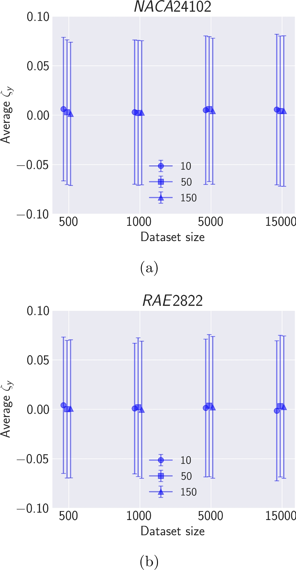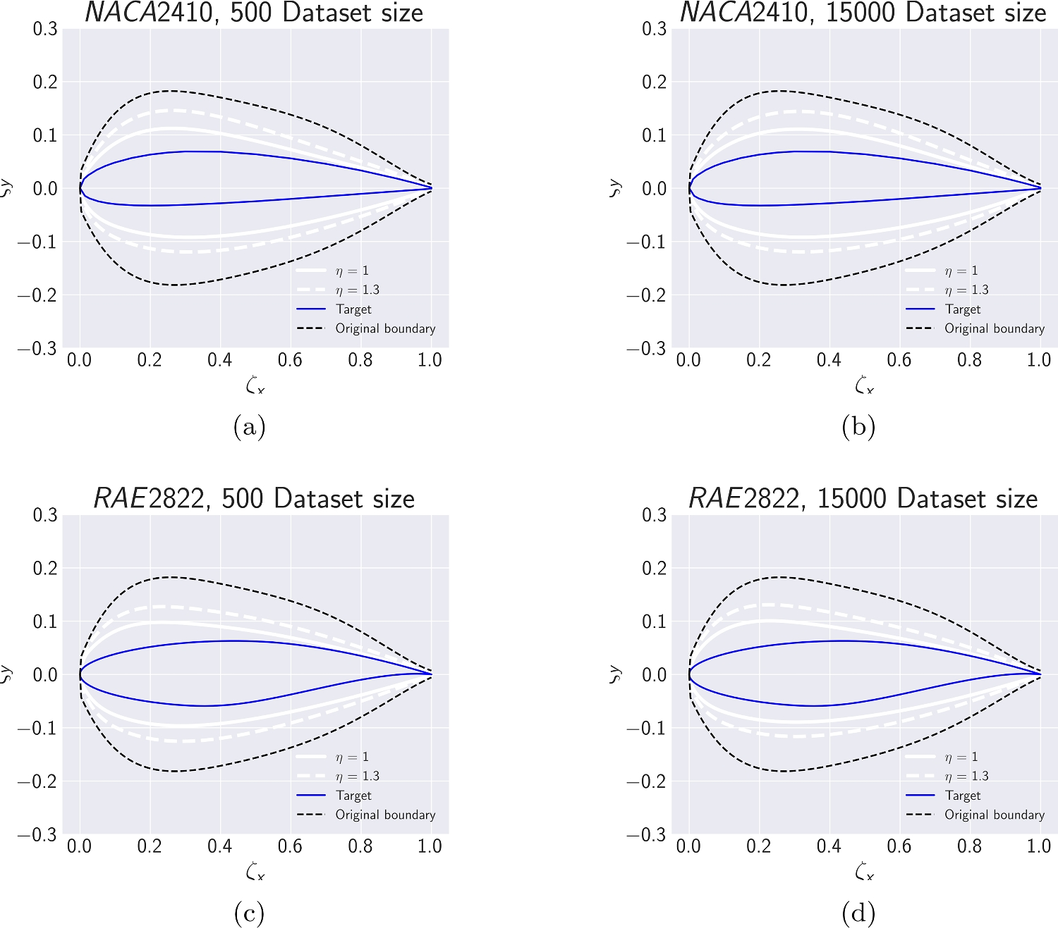 For 10, 50, and 150 runs (or solutions), the average \(\zeta _y\) and its standard deviation bandwidth exhibit only minor variations as the dataset size increases. This trend is discernible for both NACA2410 and RAE2822 in Figs. 19a and 19b. This implies that even a boundary refinement formulated by an XGB model trained with just 500 data instances and merely 10 repeated runs could be beneficial, as the boundaries remain relatively consistent despite increases in both parameters.