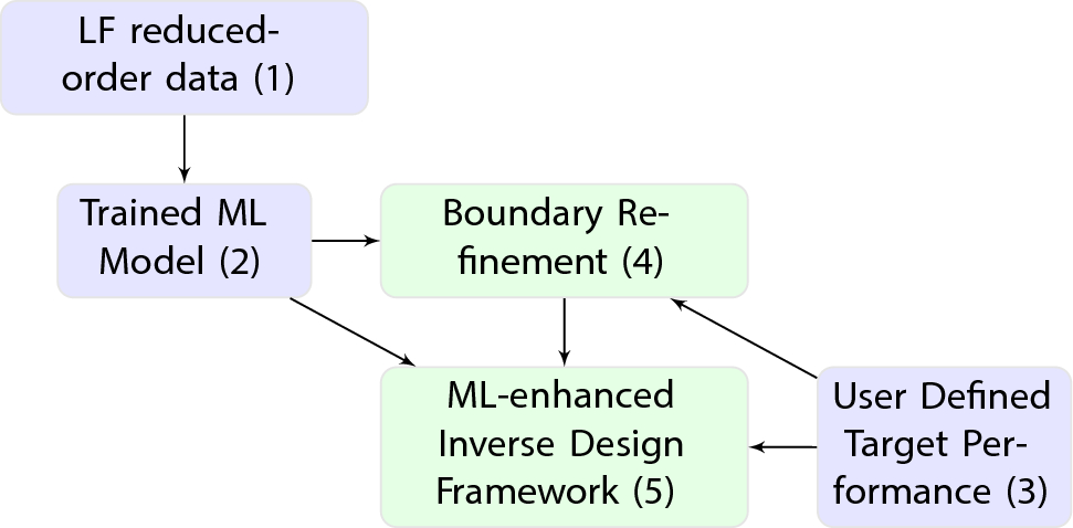 The creation of the ML model commences with the generation of LF data (1), used for training the ML model (2). Once the model is trained and its accuracy is determined, it enables the boundary refinement (4) and the ML-enhanced optimization methodology (5). The inverse design procedure requires the specification of a target performance or vector (3). Blocks highlighted in light green (4) and (5) denote stages involving an optimization process