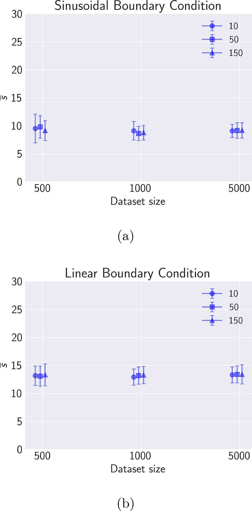 Boundary refinement technique for different datasets sizes used to train the MLP model versus the average scalar value of the BC \(\overline{s}\) for the (a) Sinusoidal BC and (b) Linear BC. The number of solutions N (denoted as runs) was varied to observe its influence on the average s value. The markers are slightly offset for each c value to improve visibility