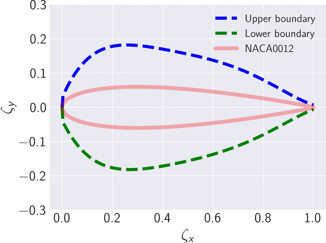 Optimization boundaries generated by multiplying the NACA0012 baseline B-Spline coefficients by a factor of 3. The \(\zeta _x\) and \(\zeta _y\) axis are the chord-length normalized x and y coordinates