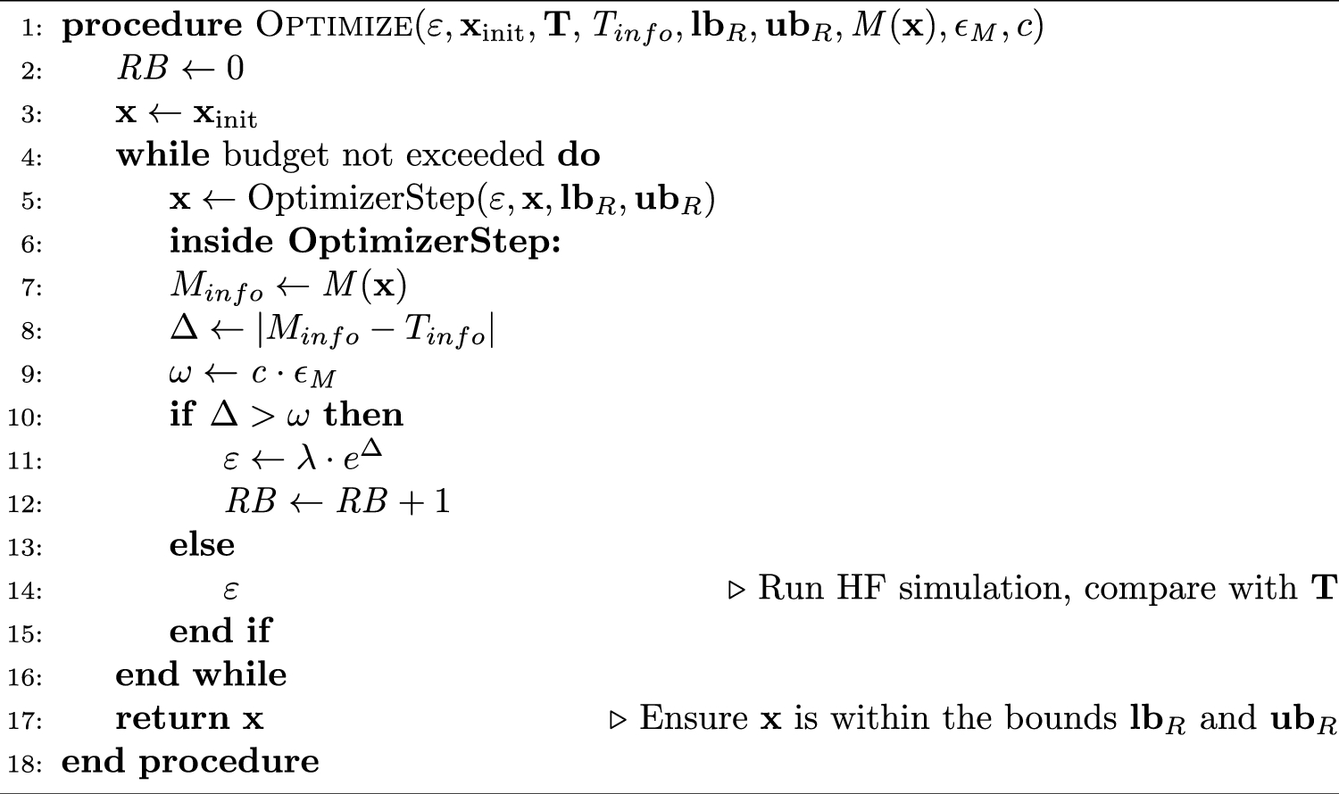 The ML model has two main tasks: (i) refine the lower and upper optimization boundaries (denoted as \(\textbf{lb}_{R}\) and \(\textbf{ub}_{R}\), respectively), and (ii) decide whether to run a HF simulation based on a design \(\textbf{x}\) being evaluated during the optimization process. The details of the boundary refinement procedure are given in Sect. 2.3. Furthermore, the pseudo-code of the ML-enhanced optimization process (ii), and all the necessary parameters are detailed in Alg. 1.