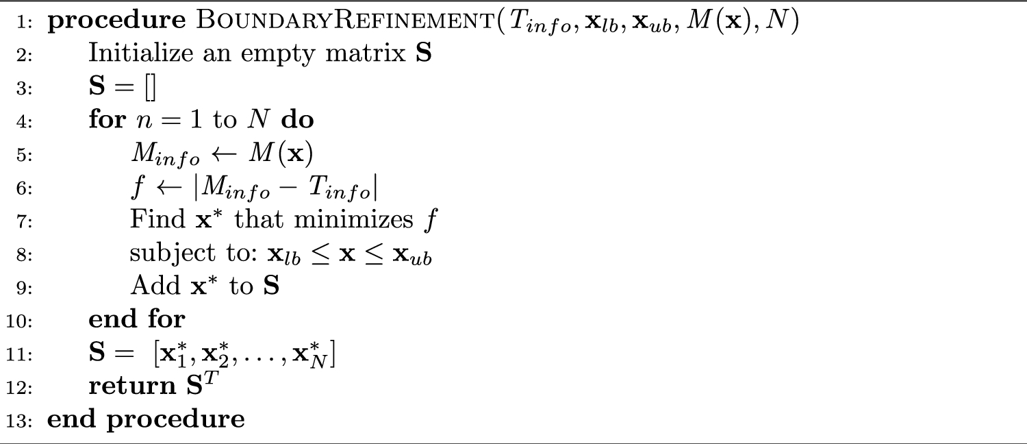The ML model is used to narrow down the optimization boundaries through a boundary refinement method, shown in Alg. 2. This approach aims to significantly minimize the demand for computational resources, an essential factor when operating within a stringent computational budget. The requirements for the boundary refinement are \(T _{info}\) and \(M _{info}\) values. The objective of each of the \(N\) optimization runs in the algorithm is to minimize the absolute difference between these two values. The \(N\) value is predefined by the user and ultimately will determine the number of optimization solutions that will be used to refine the boundaries for the ML-enhanced inverse design framework. More specifically, to narrow down the boundaries through the boundary refinement method, it is necessary to determine the optimal solution defined as in Eq. (4):