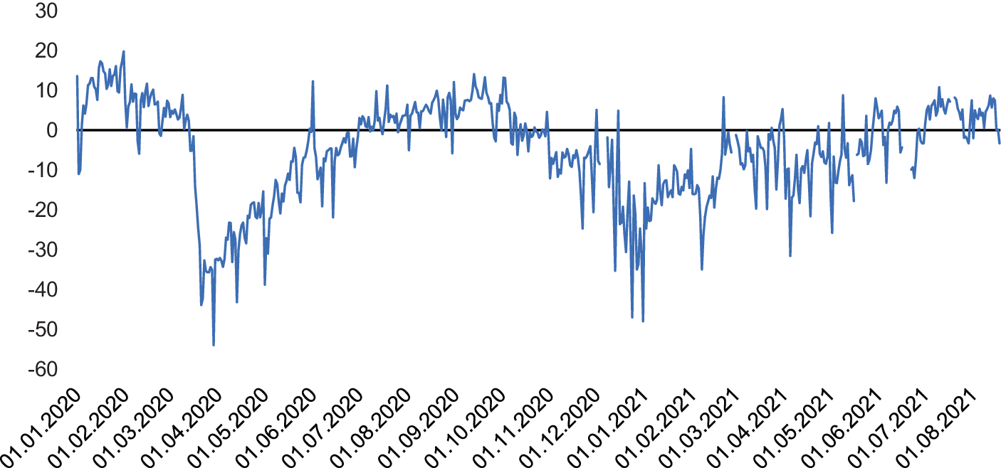 Veränderung der Mobilität in Deutschland gegenüber 2019, in Prozent (Quelle: Statistisches Bundesamt 2021a, basierend auf Bewegungs- und Mobilfunkdaten von Teralytics)