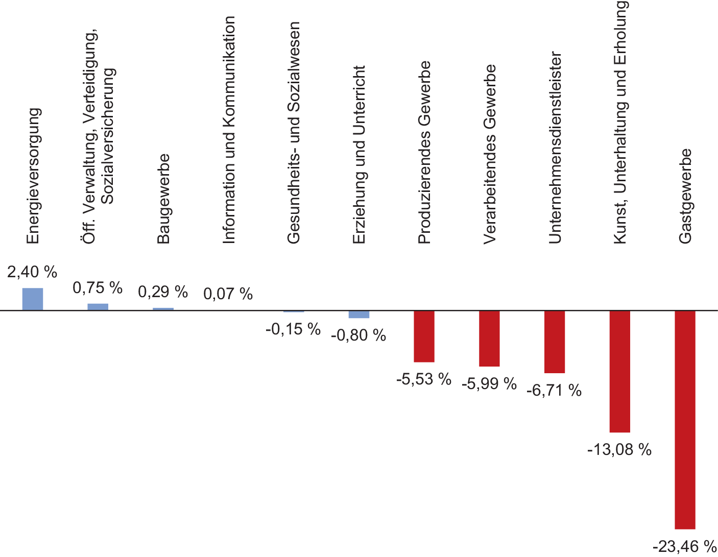 Veränderungen entlohnter Arbeitnehmerstunden ausgewählter Wirtschaftsbereiche, 2020 im Vergleich zu 2019, in Prozent (Quelle: Statistisches Bundesamt, eigene Berechnungen)