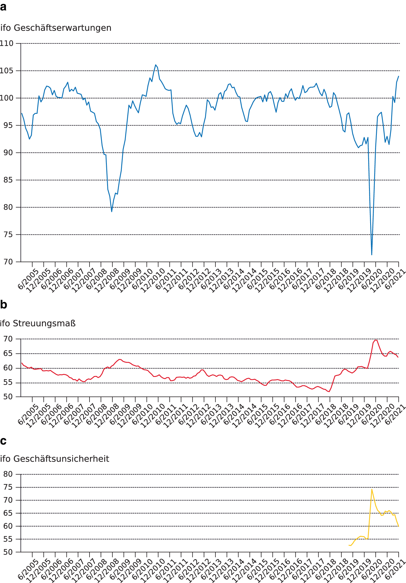 Lautenbacher, S., Sauer, S., & Wohlrabe, K. (2020). Wie schwer fällt es Manager*innen, den Verlauf zukünftiger Geschäfte vorherzusagen? Das neue Maß der ifo Geschäftsunsicherheit. ifo Schnelldienst, 73(12), 32–35.