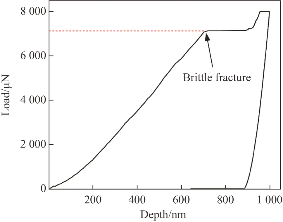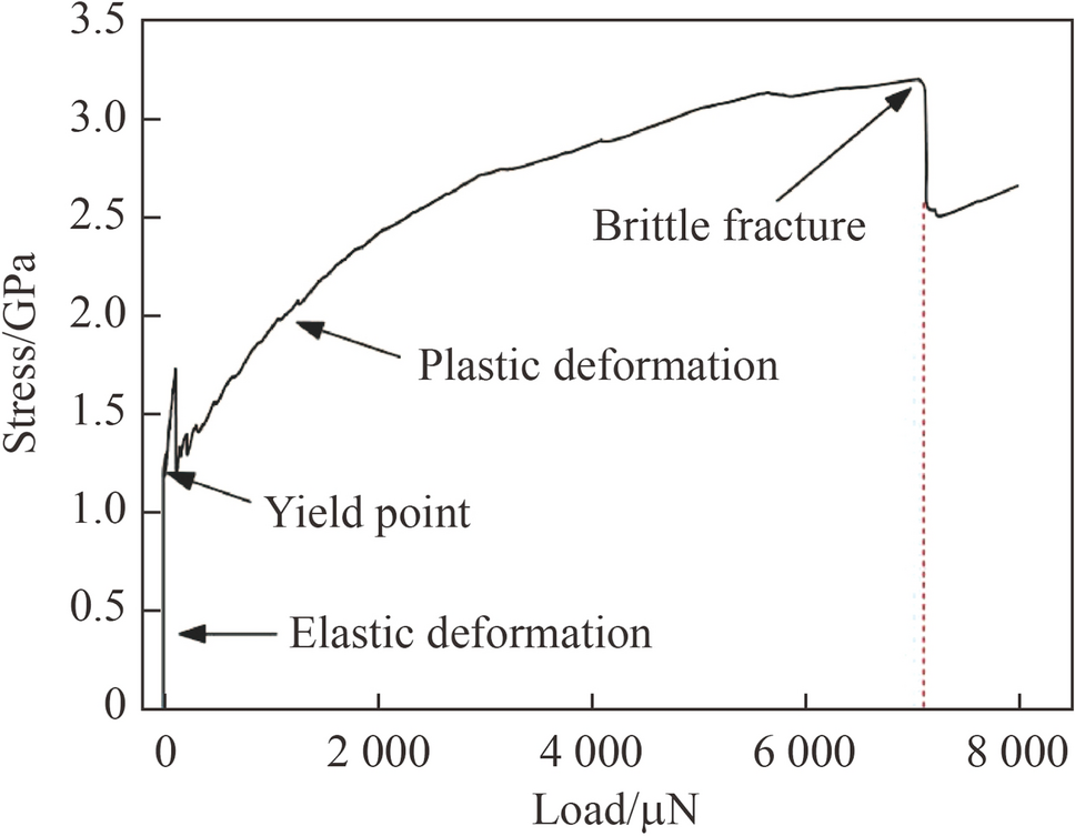To verify whether the stress induced by the dislocation pileup can lead to the brittle fracture of KDP crystals, nanoindentation was conducted using conical indenter I with an apex angle of 60° and a tip radius of 0.5 μm. A “platform” appears when the load is 7 136 μN, as shown in Fig. 9. The corresponding “platform” depth is 175 nm, but that of the pop-in events is only 11 nm. This means that the “platform” differs from the pop-in events and may be correlated to the brittle fracture. If the KDP crystals undergo brittle fracture at the “platform” position, then the deformation resistance will significantly decrease. In the stress-load curve shown in Fig. 10, the stress suddenly decreases at the 7 136 μN load and then increases to 3.15 GPa, indicating that the KDP crystals experience brittle fracture and lose their ability to resist deformation. The indentation morphology shown in Fig. 11 also confirms the occurrence of brittle fracture as evinced by the formation of some cracks around the indentation mark. It should be noted that the stress (3.15 GPa) when the KDP crystals begin to undergo brittle fracture approximates that calculated in the front of the piled-up dislocations. This means that the dislocation pileup is the primary transition mechanism from plastic deformation to brittle fracture during nanoindentation.