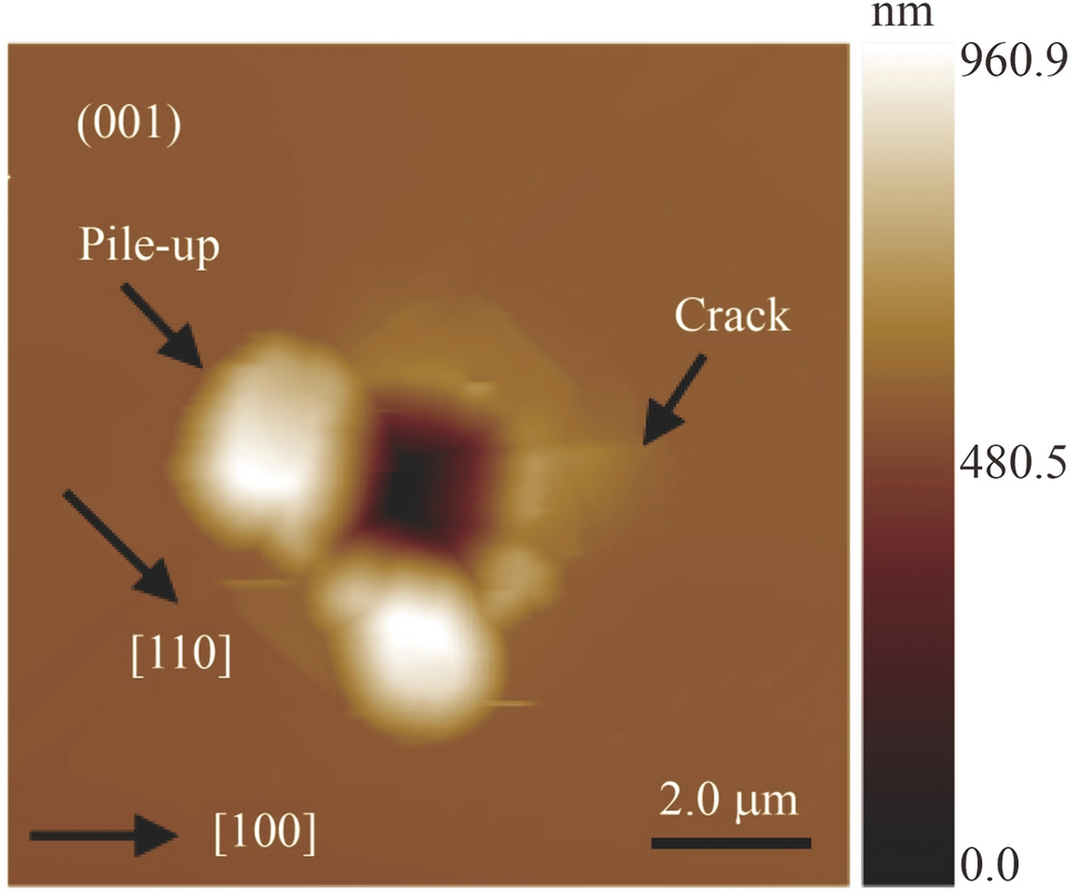 The insight into the plastic deformation mechanism of KDP crystals is essential to understand the plastic-brittle transition mechanism. The capacity of materials to resist plastic deformation is reflected by their hardness; hence, in view of their microhardness and nanohardness, KDP crystals have attracted considerable interest. For example, when the applied loads vary from 10 g to 100 g, the microhardness values of KDP crystals range 190–135 kg/mm2 and 190–160 kg/mm2 on the (100) and (001) planes, respectively [5, 10]. Kucheyev et al. [11] reported that under a 1 000 μN load using a spherical indenter, the nanohardness values of KDP crystals were 1.6 ± 0.2 and 2.0 ± 0.2 GPa on the (100) and (001) planes, respectively. These findings suggest that plastic deformations in KDP crystals may be produced at a microscale or nanoscale. Pop-in events are also correlated with the plastic deformation of KDP crystals during nanoindentation [12, 13]. Kucheyev et al. [11] observed multiple pop-in events in the load-displacement curves of KDP crystals and showed that under the 1 000 μN peak force with a spherical indenter, the first pop-in events appeared at loads of 225 ± 52 and 566 ± 87 μN on the (100) and (001) planes, respectively. References [14, 15] reported that pop-in events also existed on the doubler and tripler planes of KDP crystals. However, the origin of the pop-in event mechanism, which affects our understanding of the plastic deformation and brittle fracture mechanisms of KDP crystals, remains vague. Moreover, the study of the plastic deformation mechanism of KDP crystals using conventional characterization methods, such as transmission electron microscopy, is difficult to implement because the materials are soft, prone to fracture, and sensitive to external conditions (e.g., humidity, temperature, and applied stress).