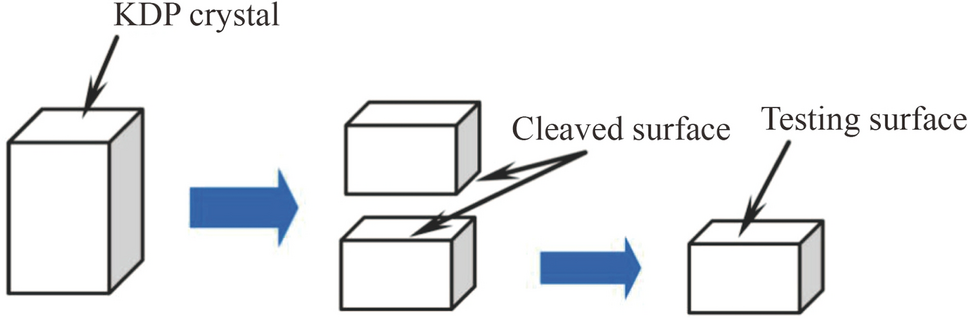 The KDP crystals provided by the State Key Laboratory of Crystal Materials, Shandong University (Jinan, China) were produced using rapid growth technology. The crystal has a tetragonal system structure with Mohs hardness, Poisson’s ratio, density, melting temperature and thermal conductivity of 1.5, 0.24, 2.338 g/cm3, 250 °C and 2.0 W·(m·K)−1, respectively. Nanoindentation experiments were conducted on the (001) plane of KDP crystals. During the cleavage process, the energy generated can be released to obtain a damage-free surface because KDP crystals are brittle. A schematic of the mechanical stress cleavage method is shown in Fig. 1 [16]. A piece of KDP crystal is cleaved into two parts parallel to the (001) plane subjected to external stress, producing damage-free surfaces for nanoindentation experiments.