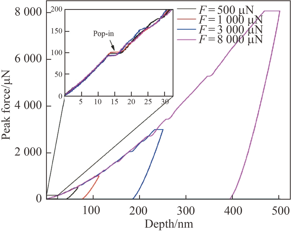 The load-displacement curves of KDP crystals under peak forces of 500, 1 000, 3 000 and 8 000 μN at a loading rate of 200 μN/s are shown in Fig. 2. To clearly observe the first pop-in events, the load-displacement curves at the initial stage are enlarged because pop-in events appear in each curve. A notable feature among the load-displacement curves is that the loads corresponding to the first pop-in events are practically identical. As shown in the inset in Fig. 2, the corresponding loads of the first pop-in events are 100, 103, 95 and 94 μN under peak forces of 500, 1 000, 3 000 and 8 000 μN, respectively. This means that the occurrence of the first pop-in events is independent of the peak force. Kucheyev et al. [11] reported that the loads corresponding to the first pop-in events were 566 ± 87 μN and 225 ± 52 μN on the (001) and (100) planes of KDP crystals using a spherical indenter, respectively. Zhang et al. [16] reported that in forming an indentation on the (210) plane, the corresponding load of the first pop-in event was also independent of the peak force. Therefore, the relationship between the first pop-in event and peak force found in this study is consistent with the published report. Moreover, the differences among the results of various studies with respect to the corresponding loads of the first pop-in event may be attributed to several factors, such as indenter shape, anisotropy of KDP crystals, and sample preparation process.