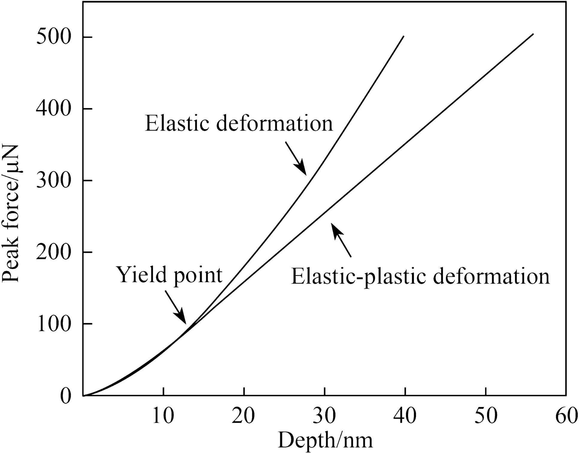 Figure 3 shows the elastic and elastic-plastic deformation curves of KDP crystals calculated according to Eqs. (4) and (11) under a 500 μN peak force. The \(E_{\text{m}}\) and \(v_{\text{m}}\) are 52.8 ± 3.8 GPa and 0.24, respectively [12]; Y is obtained from Ref. [20]. The \(E_{\text{i}}\) and \(v_{\text{i}}\) of the diamond indenter are 1 050 GPa and 0.1, respectively [21].
