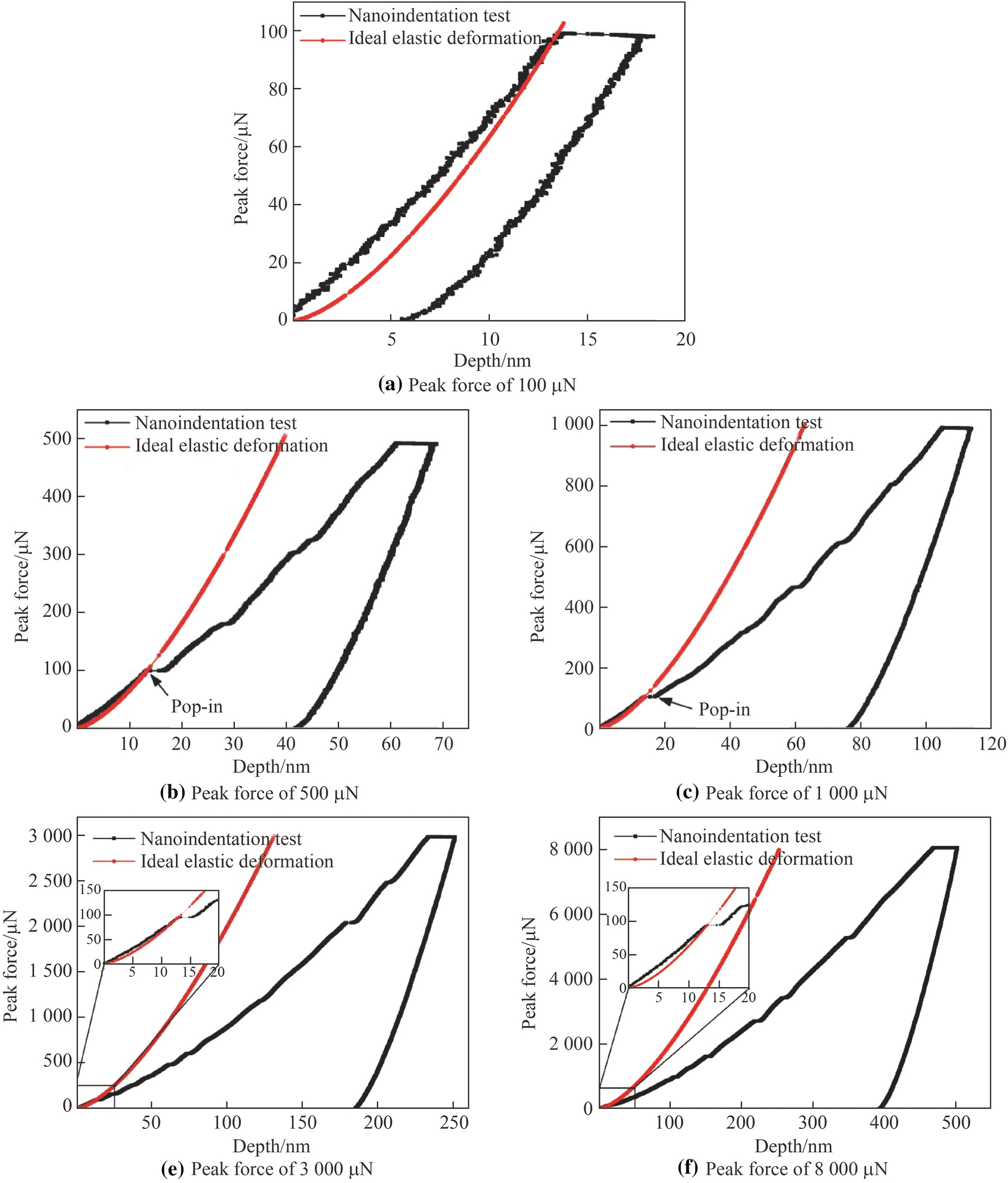 To analyze the influence of the first pop-in event on the plastic deformation of KDP crystals during nanoindentation, the load-displacement curves with peak forces of 100, 500, 1 000, 3 000 and 8 000 μN were compared with the ideal elastic deformation curves calculated by Eq. (4). Figure 4a shows the load-displacement curves under a 100 μN peak force. No pop-in event appears in the loading curve, and the slopes of the loading, unloading, and ideal elastic curves are considerably close. This indicates that KDP crystals only undergo elastic deformation under a peak force of 100 μN, which is consistent with the yield load observed in Fig. 3. In contrast to the conical indenter used in this study, Zhang et al. [16] utilized a Berkovich indenter to conduct nanoindentation tests on the KDP crystal (210) plane with a 100 μN peak force. They also reported that the KDP crystals only underwent elastic deformation under this force.
