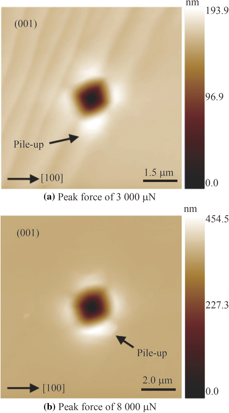 To observe the pop-in events in the loading curve, the peak forces were increased to 500, 1 000, 3 000 and 8 000 μN. Four pop-in events appear in the loading curves, of which the critical load of the first pop-in event is approximately 100 μN, as shown in Fig. 4b. When the load is less than 100 μN, the slope of the loading curve approximates that of the ideal elastic deformation curve; however, when the load exceeds 100 μN, the slope of the former is less than that of the latter. These results imply that the KDP crystal deformation changes from elastic to plastic when the load reaches 100 μN. The loads at which the deformation transitions from elastic to plastic are 103, 95 and 94 μN under peak forces of 1 000, 3 000 and 8 000 μN as shown in Figs. 4c–e, respectively. Moreover, with peak forces of 3 000 μN and 8 000 μN, no cracks occur around the indentation, as shown in Fig. 5. Hence, these results indicate the deformation of KDP crystals during nanoindentation transitions from elastic to plastic at the first pop-in event. The yield load corresponding to the first pop-in event that generates plastic deformation is approximately 98 ± 5 μN. Figure 5 also shows the indentation morphology under the two peak forces; however, these marks do not well match the shape of the indenter because of the anisotropy of KDP crystals.