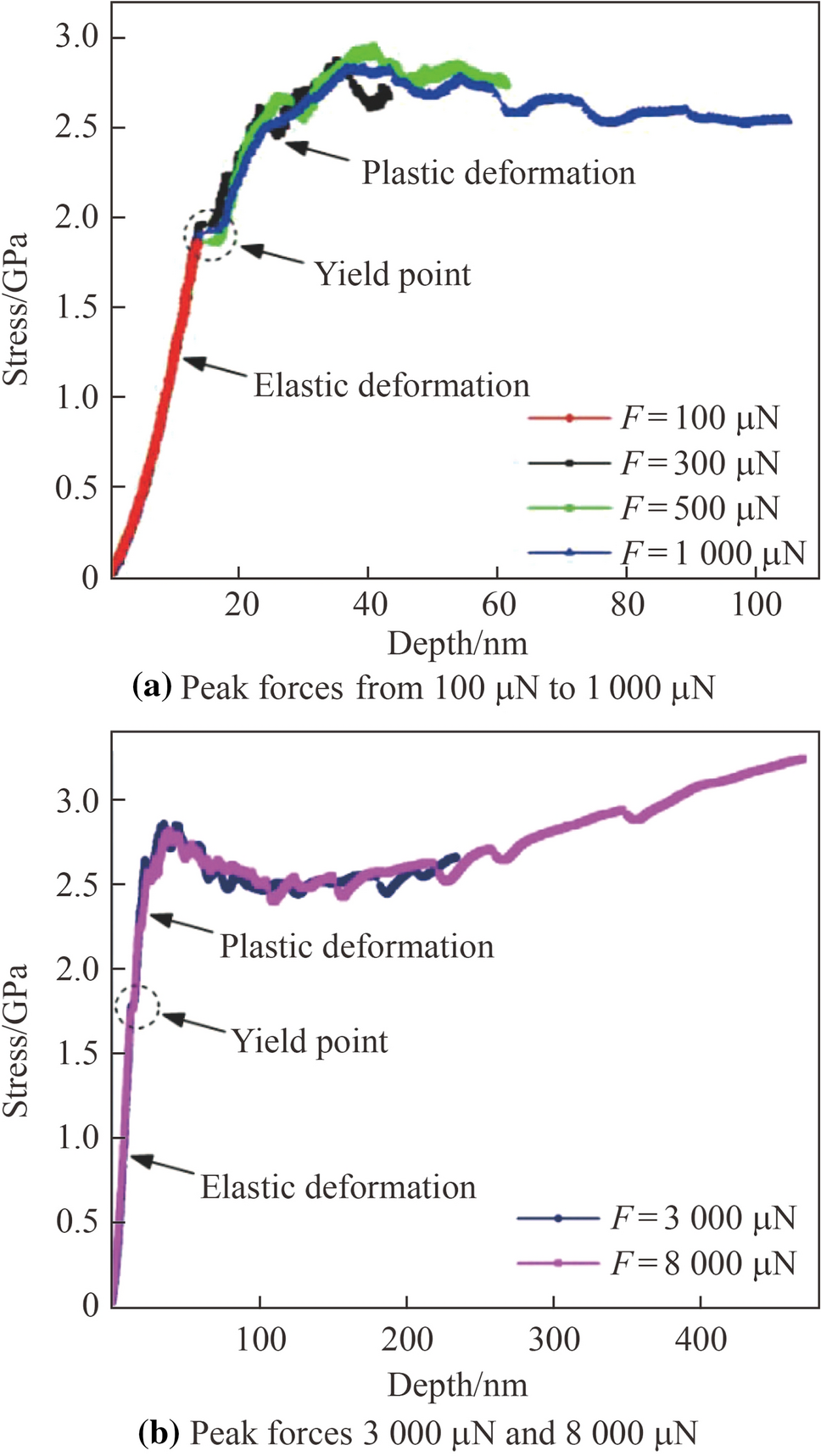 The plastic stage is observed when the stress, which increases with the indentation depth, exceeds the yield point. At 2.85 GPa, however, the stress decreases with increasing indentation depth. Then, as the indentation depth further increases, the stress increases again, as shown in Fig. 6b. As a result, the relationship between stress and depth in the plastic stage at room temperature is nonlinear.