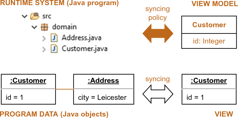 In the first case, reification becomes a modeling process that may help either to capture the main concepts and structural constraints intermingled in the source code, refactor the application, abstract the existing domain model, or document the system’s design (architecture). Abstraction is supported by selecting classes and structural features that need to belong to a view model. Refactoring may involve relocating features and aggregating/splitting concepts, which will be discussed when defining synchronization policies in subsequent sections.