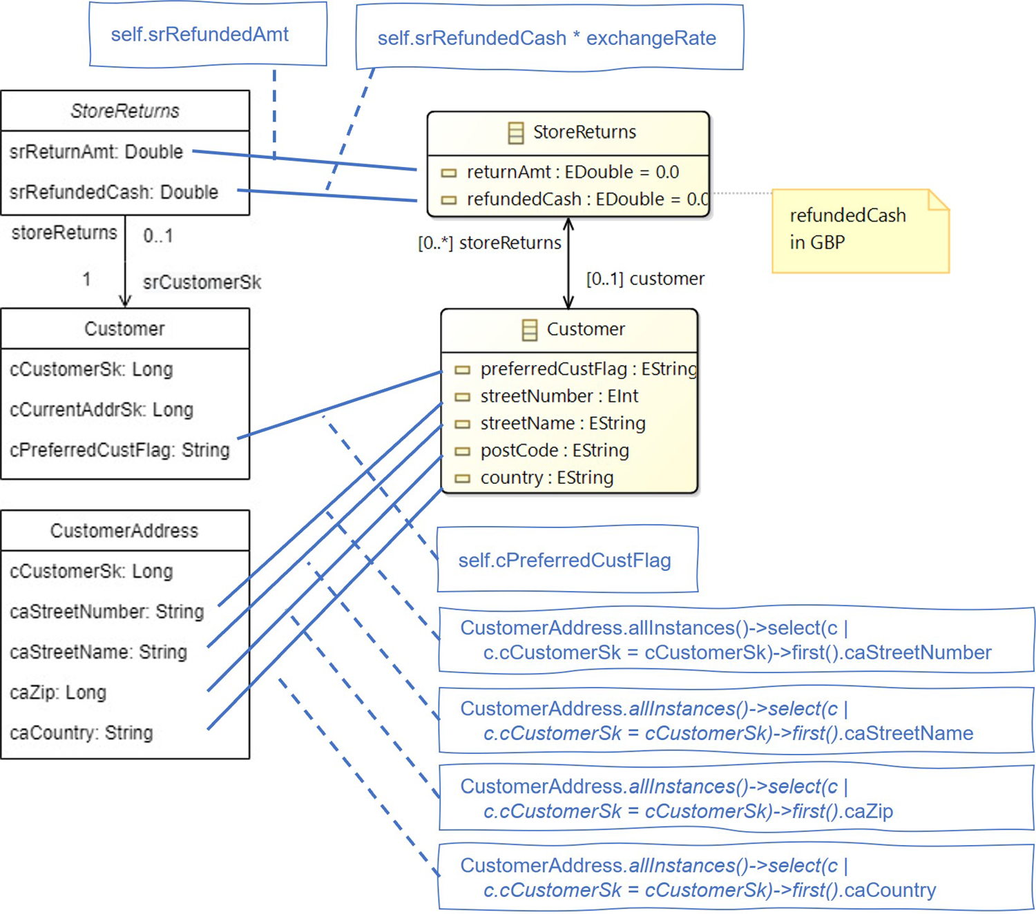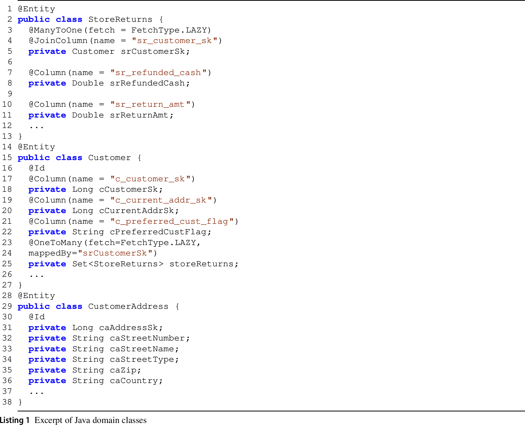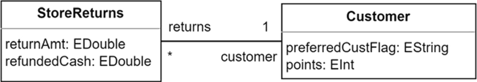 An excerpt of a Java program containing domain knowledge is given in Listing 1. This listing declares the domain classes StoreReturns, Customer and CustomerAddress, decorating their fields with JPA annotations1 that link the classes to tables in a relational database, used in the experiments in Sect. 6. The corresponding class in the view model, where only the fields of interest have been captured, is represented in Fig. 2. In this example, it is worth noting that the class CustomerAddress in the listing is not represented in the view model to show how some elements of a program can be filtered away. In addition, the Customer class in the view model has an additional attribute points, which is not present in the original source code. Such an attribute illustrates that the view model can include other knowledge not present in the original program, building an extension of the original program.