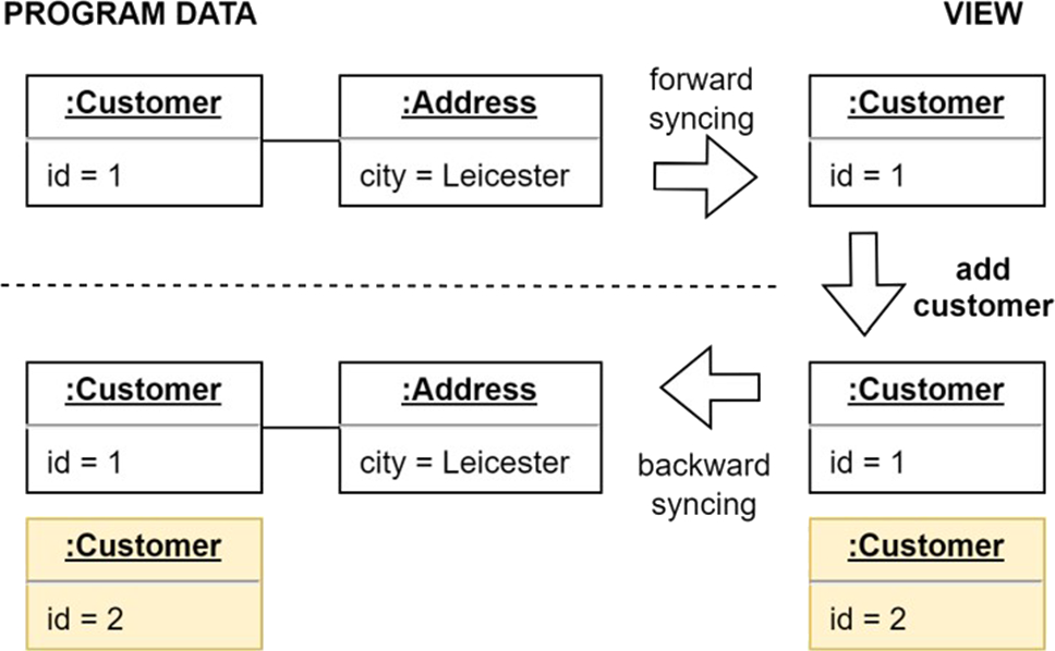 The first scenario, shown in Fig. 3, is an example of projection, as the class CustomerAddress does not appear in the view model. In the forward synchronization, the Customer1 loses its address in the view. However, once we perform an update by adding one more Customer in the view, the backward propagation retains the address of the Customer1 in the original program. However, it does not initialize any address for Customer2.