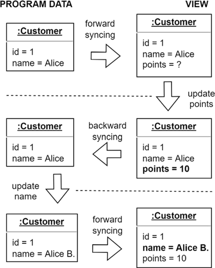 The second scenario, shown in Fig. 4, is an example of an extension of the domain knowledge in the program. The Customer1 is initialized in the view without the attribute value points. After the update, the backward propagation forgets this data, which cannot be stored in the Java Customer object. However, after an update of the name on the program snapshot, the forward propagation preserves the points value and updates the name.