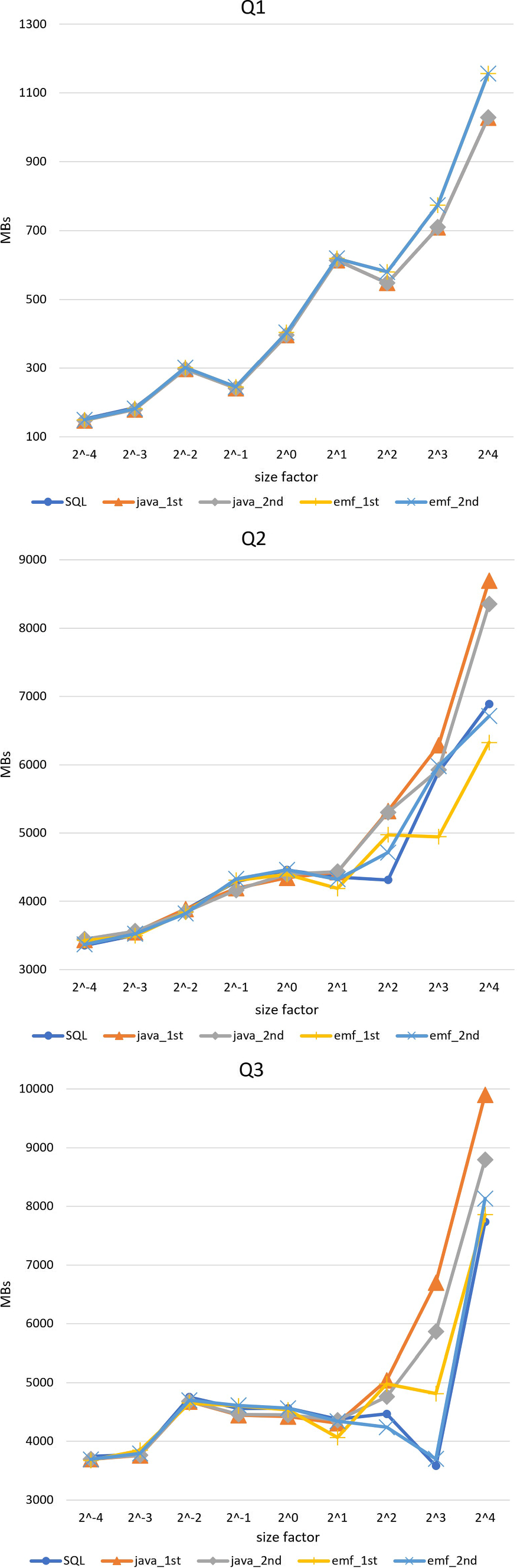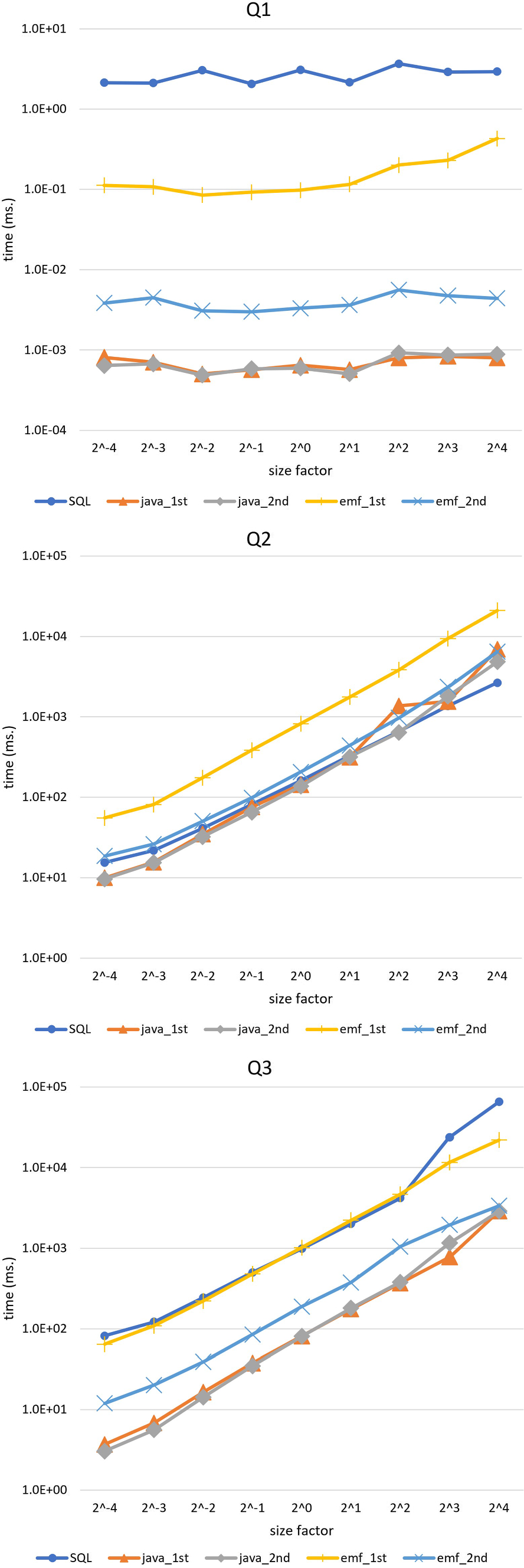 For large model instances, e.g., \(2^3\), in Q3, it can be observed that initialization time (the sum of initial synchronization time and deferred synchronization time) together with query time Q3 (EMF 1st), excluding loading time, is better than the time used to compute the same query with SQL. This shows that the scalability of \(\textsc {EMF-Syncer\ }\) performance can be better than the scalability of query evaluation in industry database management systems in some scenarios. The reason is the availability of contextual information in memory that is readily exploited when evaluating navigation expressions, which need to be computed when using SQL. Domain-specific query optimization, using indexing, was not performed as we used the relational schema provided in the TPC-DS benchmark resources.