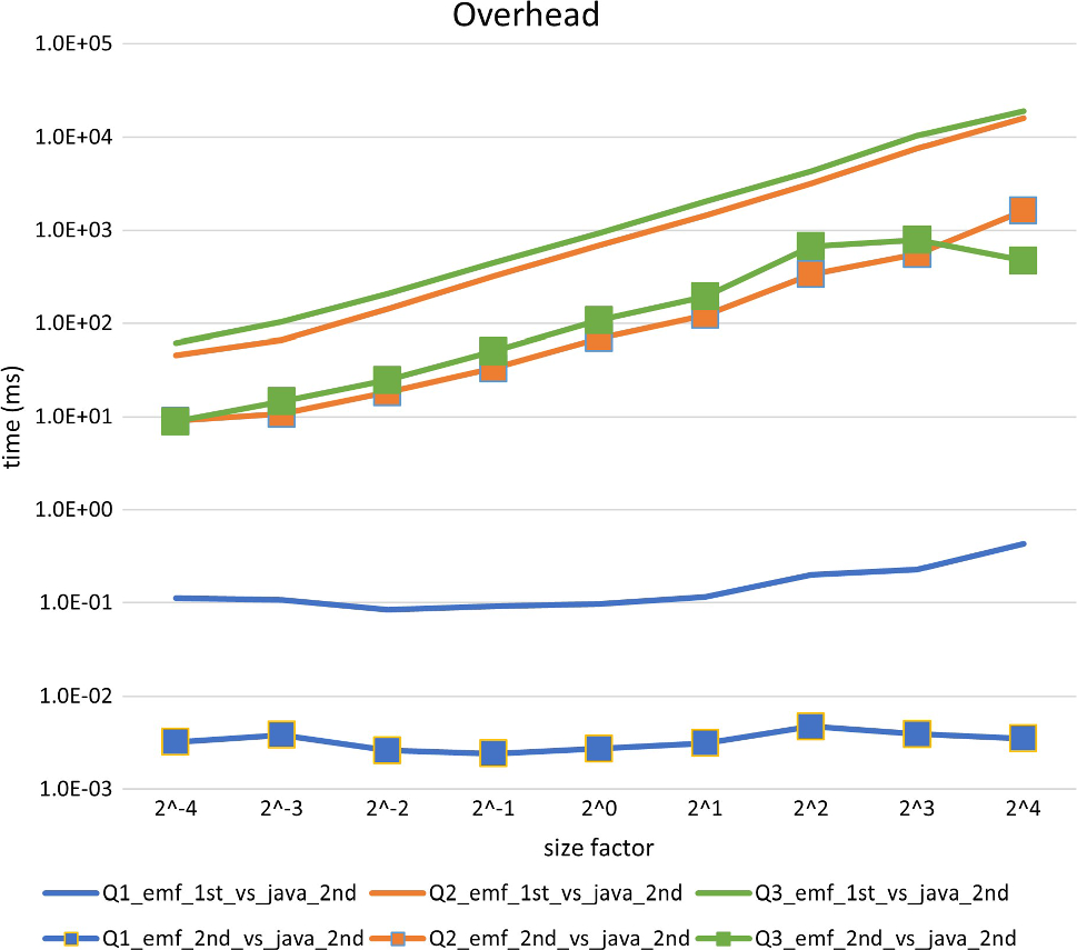 Incremental propagation of updates is efficient, even for large updates. For example, updating 124K objects takes about 120 ms, in Q3_Backward, for a size factor of \(2^4\). Forward incremental propagation (from Java to EMF, once model instances are synchronized) is based on the same algorithm and the same data structures, and it, therefore, exhibits a similar performance.