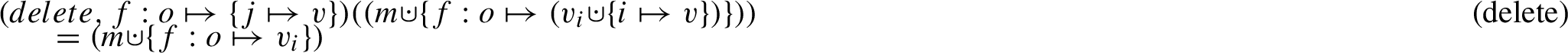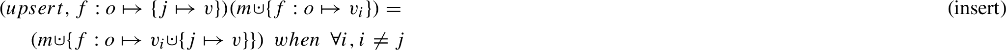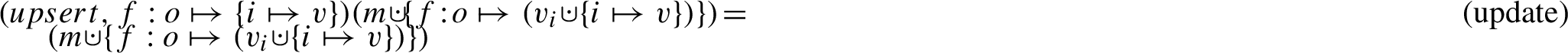 In the equational presentation above, terms − with variables − are used on the left-hand side of the equations to denote a search of the relevant feature values in a given model instance, through pattern matching. An upsert update is characterized with the equations (update), which updates the value \(v'\) at position i with the new value v in the feature f for object o, and (insert), which inserts a new value at an index j that is not used. A delete update is characterized with the equation (delete), where the expression \(\{ i \mapsto v \}\) characterizes the set of indexed values with the value v, in case there are duplicates. Hence, deletion has set semantics, and all entries containing the value v are deleted, irrespectively of their indexes. Equations (identity) and (composition) define the base case of the inductive definition of the application operator over the structure of updates, and that update application is compositional.