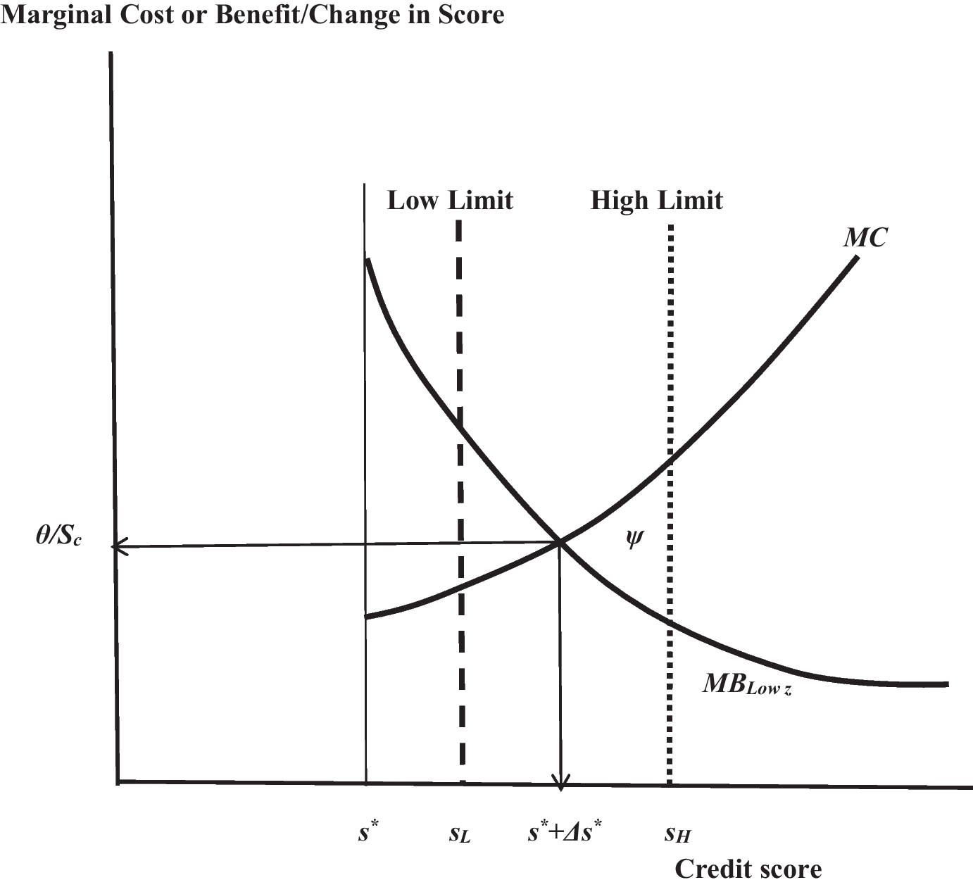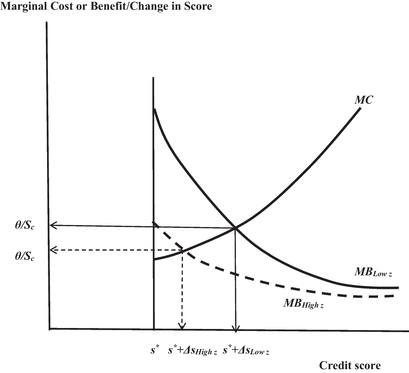 The applicant’s decision to expend effort to change her credit score in response to lender risk-based pricing is demonstrated in Fig. 1. The figure illustrates behavior of two otherwise identical applicants with either high or low initial credit scores. The marginal benefit schedule is the savings in credit cost from an increase in credit score, i.e. – PsB(z), and the marginal cost schedule is the cost of achieving that increase in scores, θ/Sc. Marginal benefit and cost have natural limits, at zero and infinity because, as s becomes sufficiently large, both Ps and Sc approach zero. There is a single marginal benefit schedule assuming that the two applicants are observationally equivalent except for their initial credit scores.15 The lender only observes the final credit score and is unaware of c.