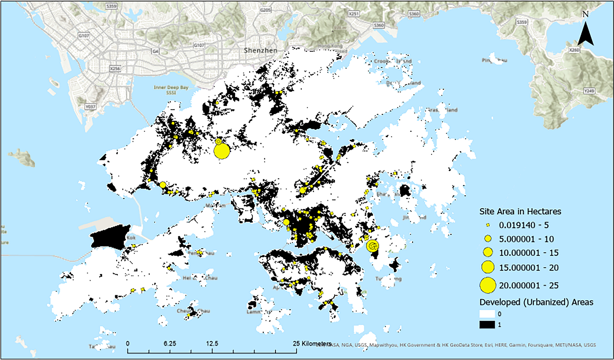 The Distribution of the Government Land Reserves for Residential Developments in the year 2000. Note: Author’s presentation. Data are from the Development Bureau of HKSAR, the Planning Department of HKSAR, and the Lands Department of HKSAR. It visualises the government land reserves where the land areas are explicitly known (e.g., published in the annual reports). As the reserves from the land survey were digitalised from a pdf map by image classification techniques (accounting for less than 20% of the total government land reserves), they cannot be visualized proportionally with the reserves from other data sources. Thus, they are not shown in the figure above
