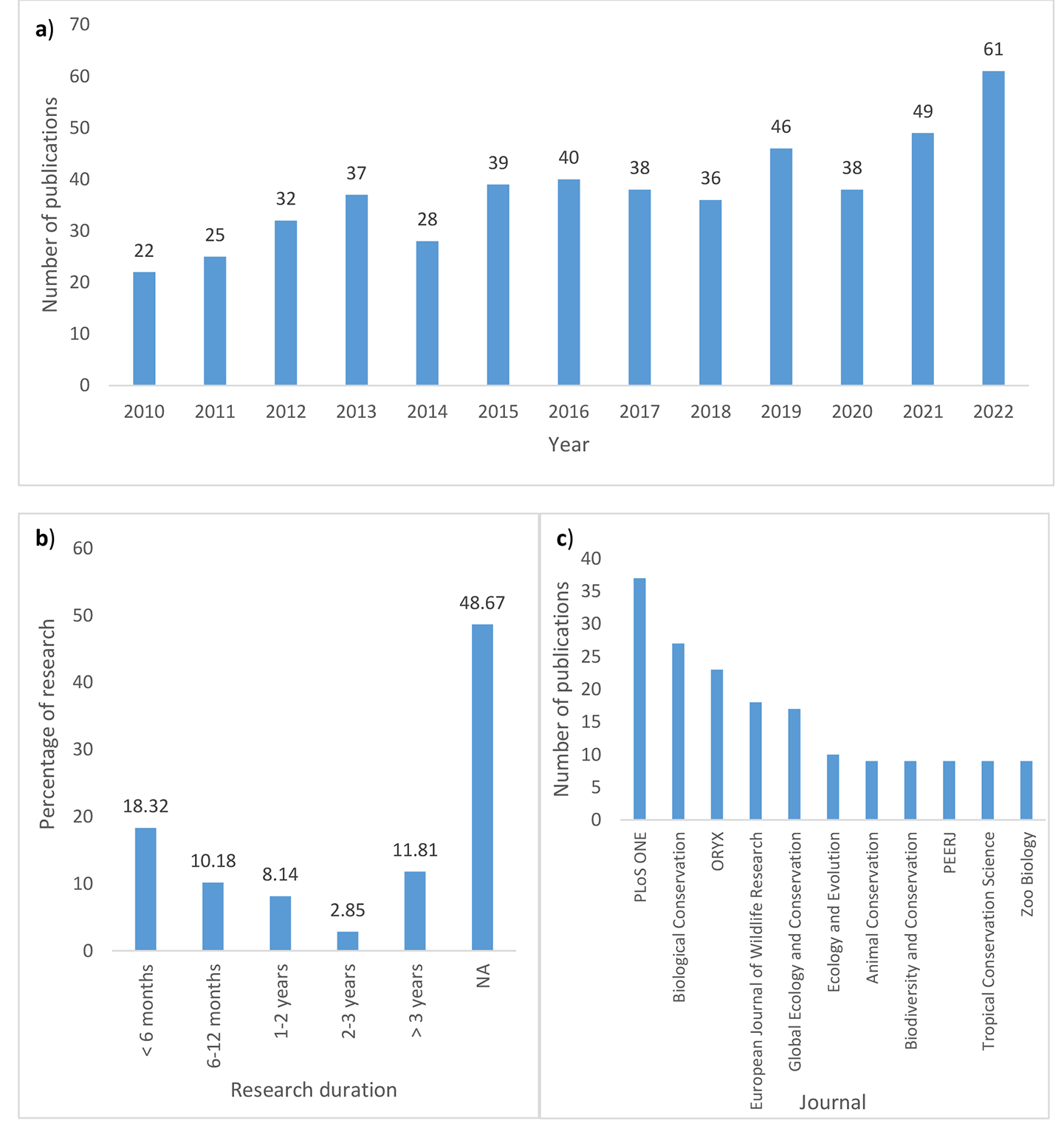 (a) The number of peer reviewed articles on Bengal tigers, (b) duration of empirical studies on Bengal tigers and (c) the top 11 journals that most frequently published research on Bengal tigers,2010 to 2022. (Note: NA denotes not mentioned/applicable)