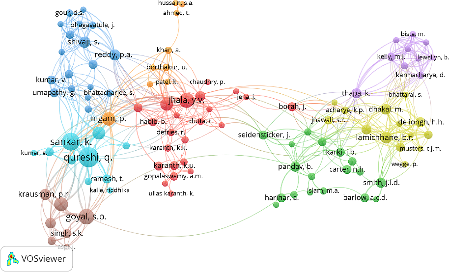 We further found that authors from India have collaborated with the highest number of co-authors, closely followed by those from Nepal. We also identified the presence of eight author groups engaged in collaborative efforts (Fig. 2). Among these, we found two distinguishable groups: one with five interconnected clusters highly interlinked with prominent researchers from India, and another group with three clusters highly interlinked with the prominent researchers from Nepal, USA and India.