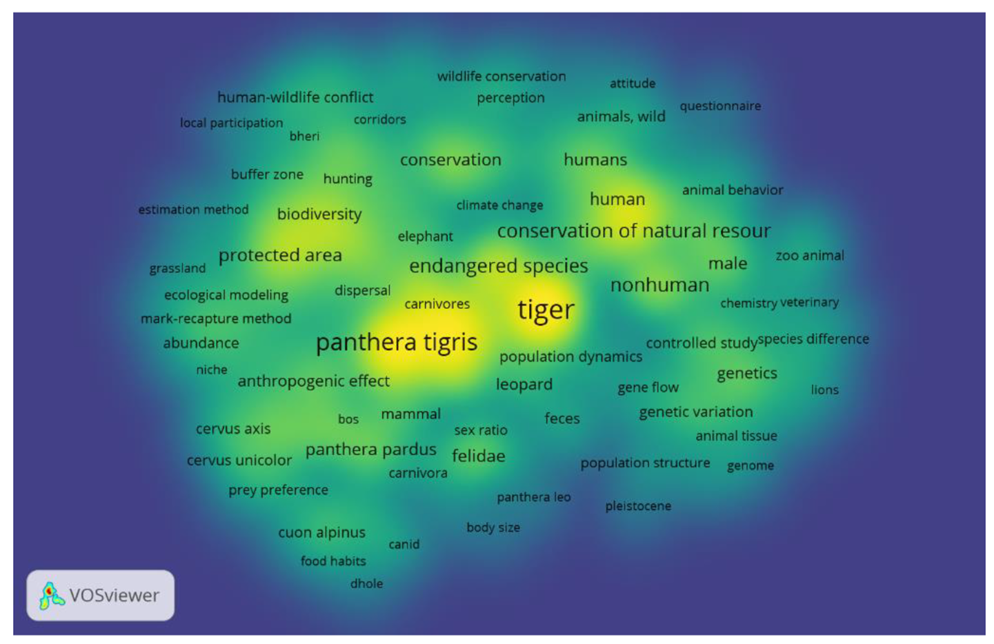 Keyword analysis revealed that obvious words such as ‘tiger’ and ‘Panthera tigris’ were most frequently used words (> 100 times) in titles and abstracts of published articles (Fig. 3), but ‘protected area’, ‘endangered species’, ‘conservation’, ‘human’ and ‘biodiversity’ also featured heavily.
