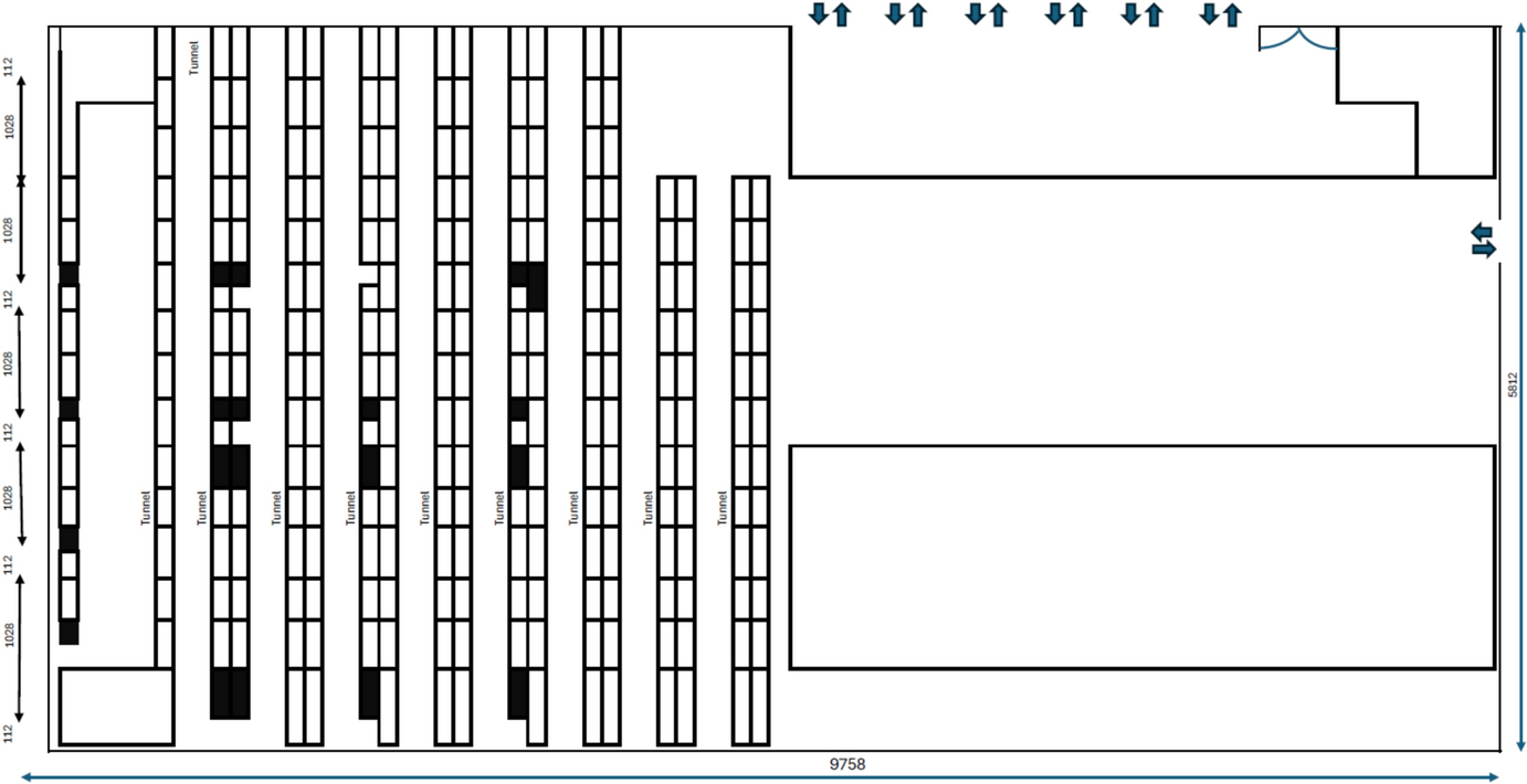 The warehouse uses a conventional layout structure. This layout arranges racks with parallel aisles (Oxenstierna et al. 2022). Figure 1 depicts the layout of the warehouse. Products are organized from the bottom of the shelves, grouping similar products within each column. Then, another product is placed similarly, following the same bottom-to-top arrangement. Furthermore, the figure illustrates how a warehouse layout is designed specifically for order picking. The collection point is located at the top right corner, and there is a designated tunnel that serves as the primary pathway for pickers to navigate through the aisles to pick up customer orders.