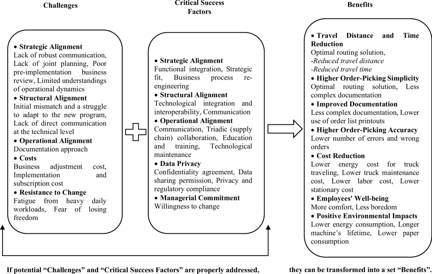 The term benefits refer to the positive outcomes and improvements that can be achieved from using the AI-based system. Challenges encompass the obstacles and barriers that can hinder the successful implementation and utilization of the technology (Birkel and Hartmann 2019). Critical success factors are the factors that, when effectively addressed, significantly enhance the likelihood of achieving the desired improvements driven by the system (Pinto and Rouhiainen 2001, as cited in Nasir and Sahibuddin 2011). This study uses the technology-organization-environment (TOE) theory (Tornatzky et al. 1990) to contextualize the benefits, challenges, and critical success factors associated with the AI-based system in the warehouse. Furthermore, by linking these factors to the dynamic capabilities of Teece et al. (1997)–namely, sensing, seizing, and transforming, with a particular focus on sensing and transformation components– we aim to provide insights into how firms can effectively adopt and utilize AI-driven innovations.