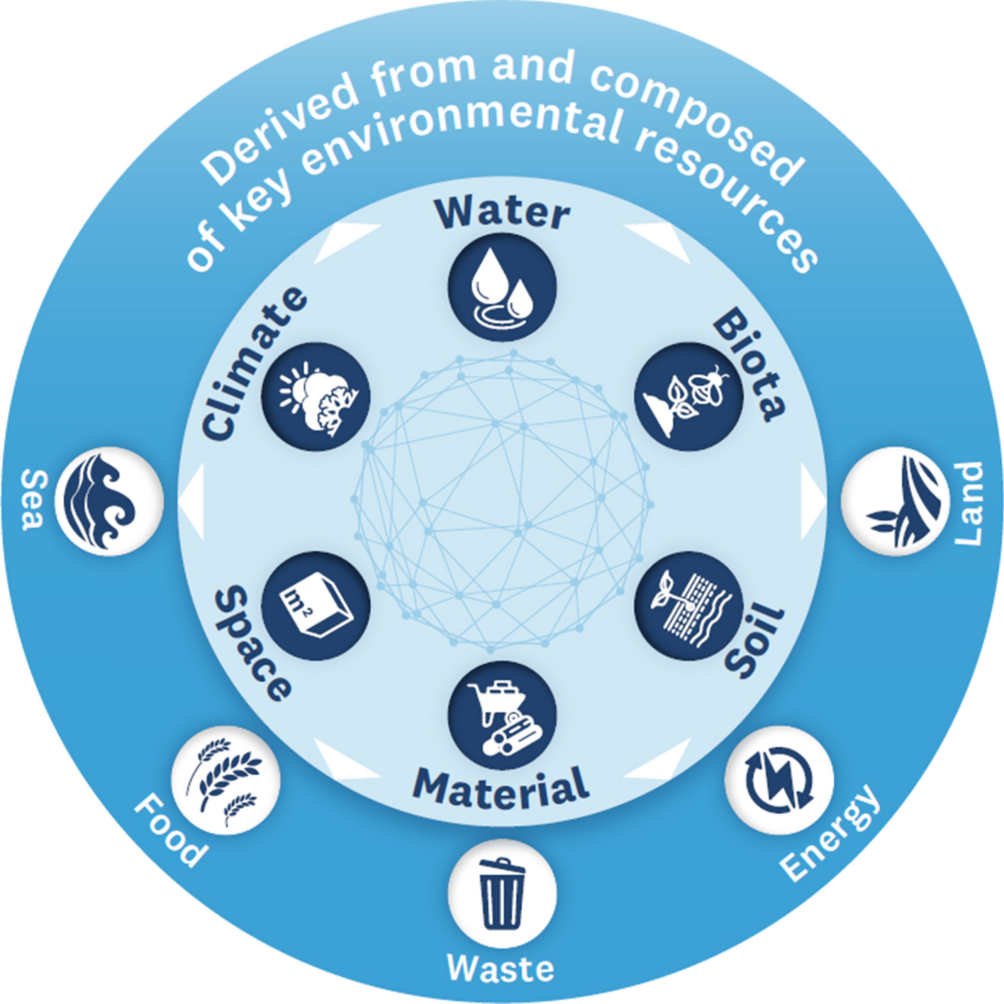 The law of Parsimony (or Occam’s razor) is adopted to propose a set of key environmental resources in a Resource Nexus approach. It is a Problem Solving Principle, recommending that explanations are constructed with the smallest set of elements (Duignan 2023). The initial set of resources in the Resource Nexus (presented in the previous Section) are reduced to six environmental resources and a couple of resources that are derived from such environmental services (Fig. 2). Deviations from the original set of resources are explained in the following. Figure 2 includes two layers. The first layer includes key environmental resources and six are identified: