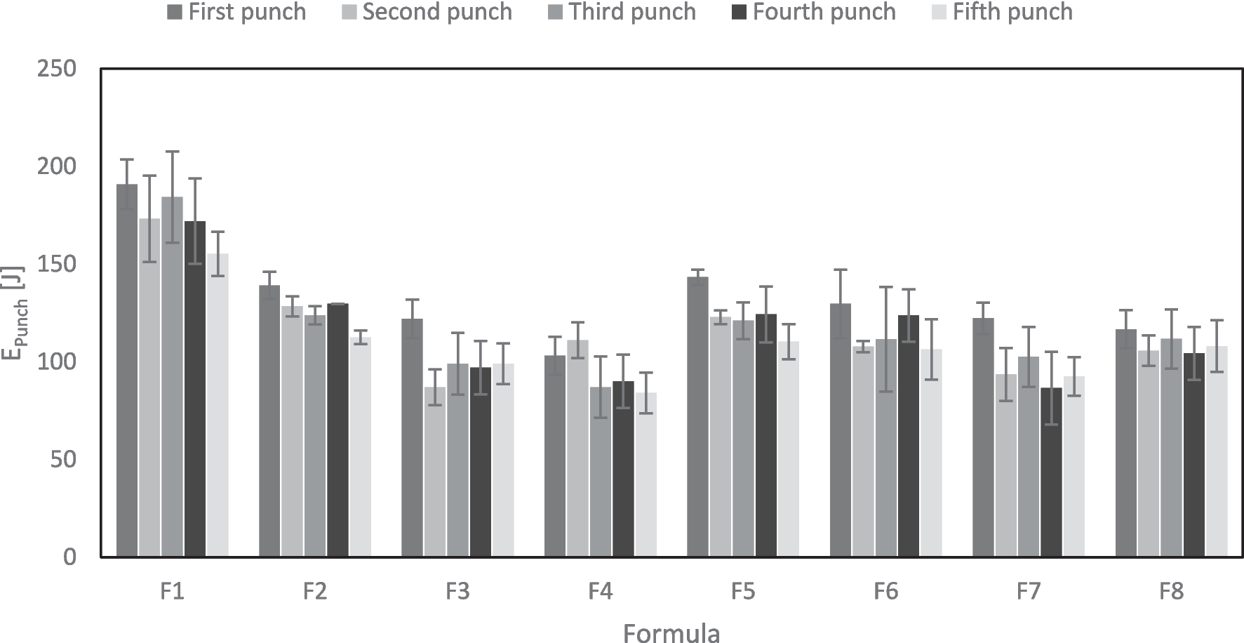 Energy absorbed per punch by each composition in the quasi-static punching test