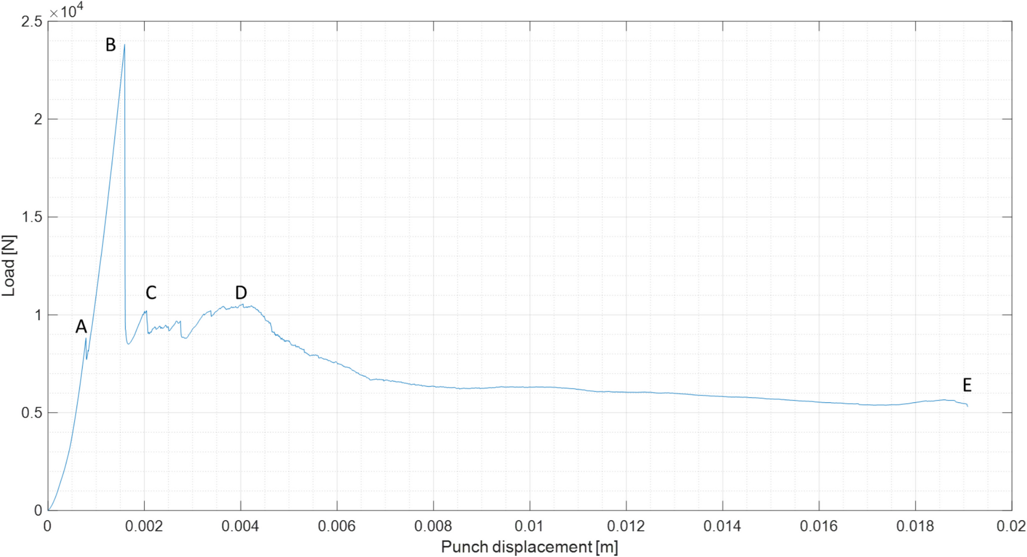Figure 11 shows a typical load vs displacement curve obtained during the QS-PST. For most of the configurations, six important peaks appeared at different punch displacements, labeled in Fig. 11 as A, B, C, D and E.