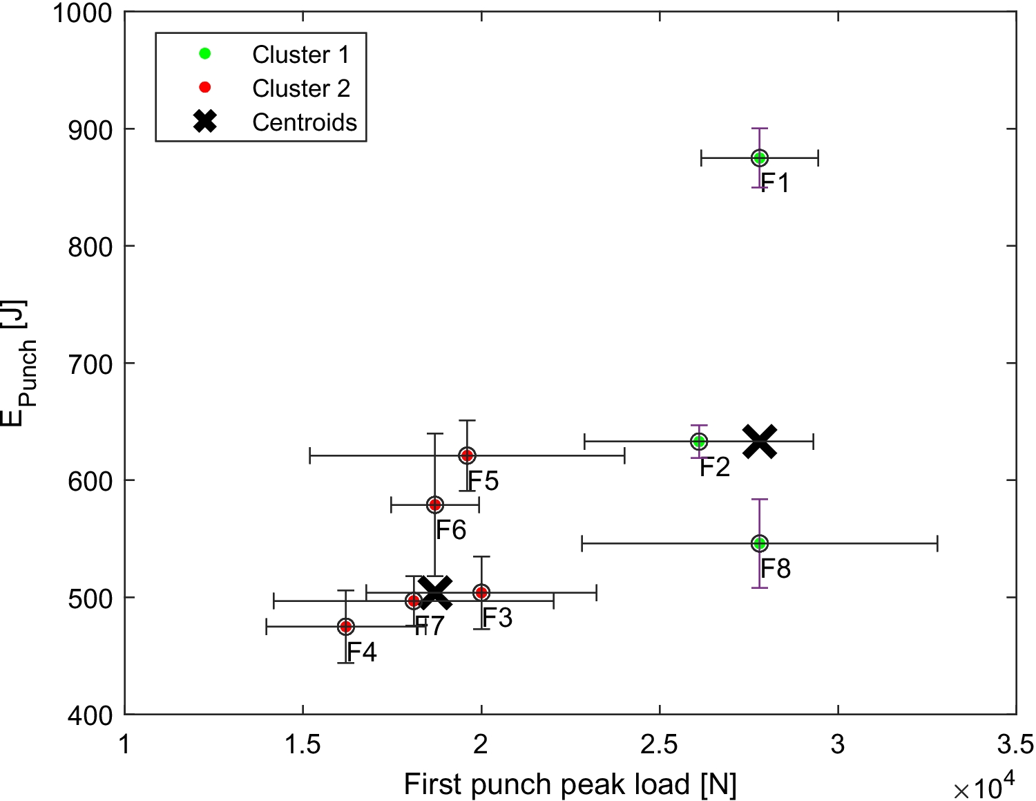 As can be observed in Fig. 14, all compositions that fail the ballistic test are grouped in cluster 2, while F2, F8 and F1 which pass the ballistic test are grouped in cluster 1. Thus, combining both parameters and using the k-means hard clustering algorithm could be a functional technique to predict if a certain composition could pass a ballistic test under NIJ 0108.01, level IIIA standard without performing dynamic testing.