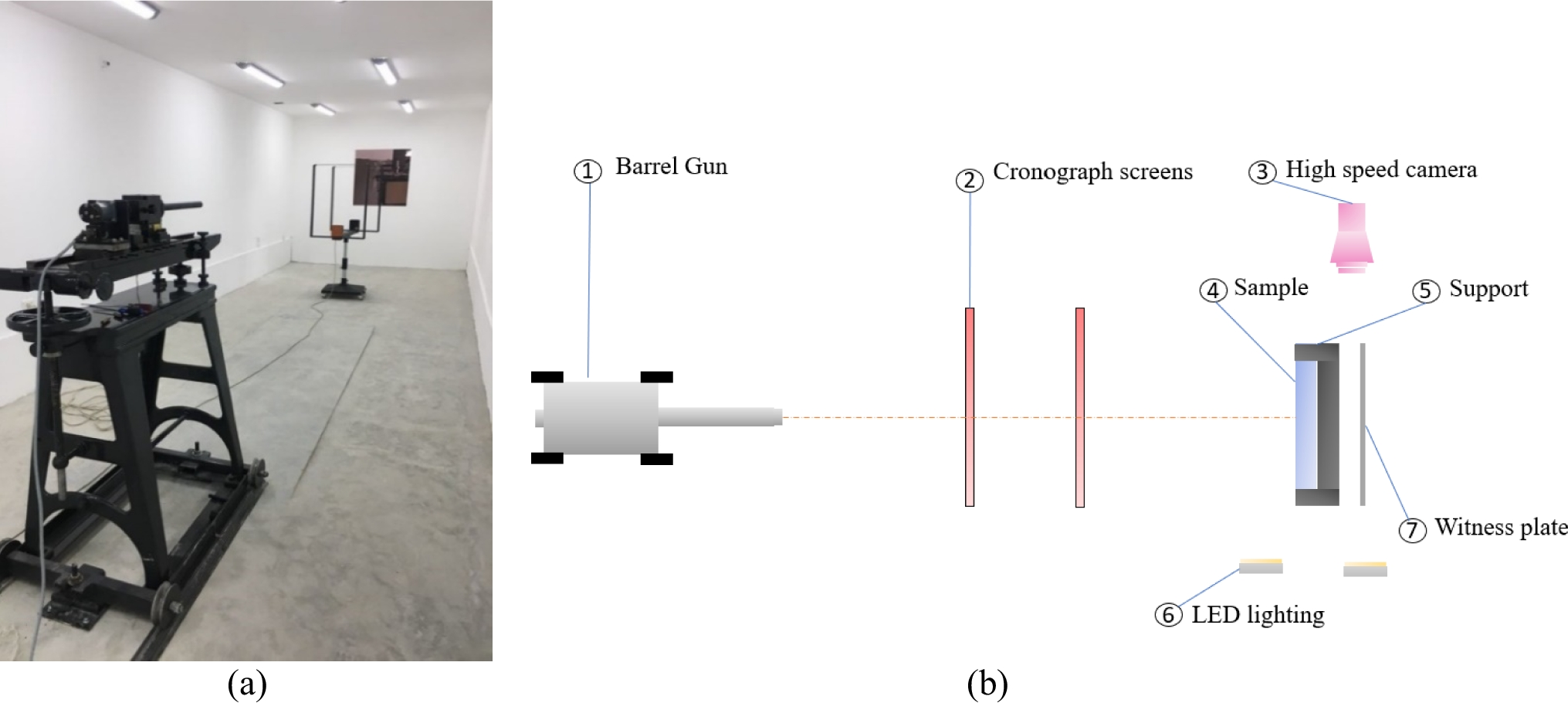 a Ballistic set-up used to carry out V50 multi-hit test. b Ballistic configuration and devices used for the test