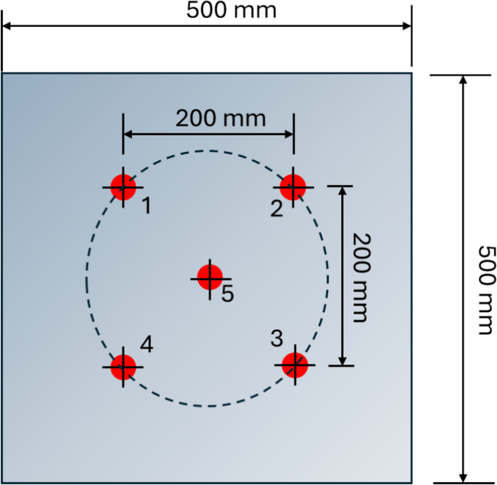At least five samples of 500 mm × 500 mm size per configuration were required in this test. In the first sample, all the shots were fired near the maximum velocity defined in the NIJ 0108.01, level IIIA ballistic standard. In order to get approval, this standard states that the armor should withstand five shots at 426 ± 15 m/s without complete penetration following the impact pattern shown in Fig. 3. The ballistic testing procedure employed the up-and-down method [28] for the final impact, aiming to maintain a consistent impact velocity range across the preceding 4 impacts. Given the intention to fire at or near the upper limit of the velocity stated by the standard, intending to make the test more rigorous, the first specimen in this study was impacted with five shots at around 441 m/s ± 5 m/s. If a complete penetration occurred in any of these shots, then the residual velocity needed to be measured by using the high-speed camera. In the case of a penetration occurrence in the last shot, the first four shots of the following sample should be fired again at around 441 m/s, and the last shot should be fired 30 m/s below this velocity, corresponding to a velocity of around 411 m/s. Conversely, if no penetration occurs in the last shot of the first specimen, the initial four shots of the following target will keep their velocity (441 m/s) and the last shot should be fired at 30 m/s above the this velocity, at around 471 m/s. This procedure should continue until getting at least two penetrations and two no penetrations. The 30 m/s step velocity was selected in alignment with the velocity tolerance specifications outlined in the NIJ 0108.01 Level IIIA ballistic standard. While opting for a lower step velocity enhances the precision of the ballistic limit assessment, it also necessitates firing numerous samples of a single composition to gather the requisite penetration and non-penetration data for computing the ballistic limit.