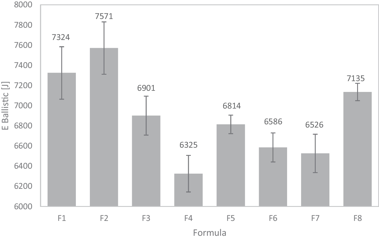 The total energy absorbed by each of the eight configurations during the ballistics tests is shown in Fig. 6. The error was defined as the median deviation estimated in the energy calculation of the five specimens tested per configuration. F4 was the armor that absorbed the lowest amount of energy with a mean of 6325 Joules, while F2 was the composition that absorbed the highest amount of energy followed by F1 and F8 composition. These latter compositions did not fail the test under the velocities of the standard the NIJ 0108.01, level IIIA, while compositions F3, F4, F5, F6, and F7 presented at least one failure.