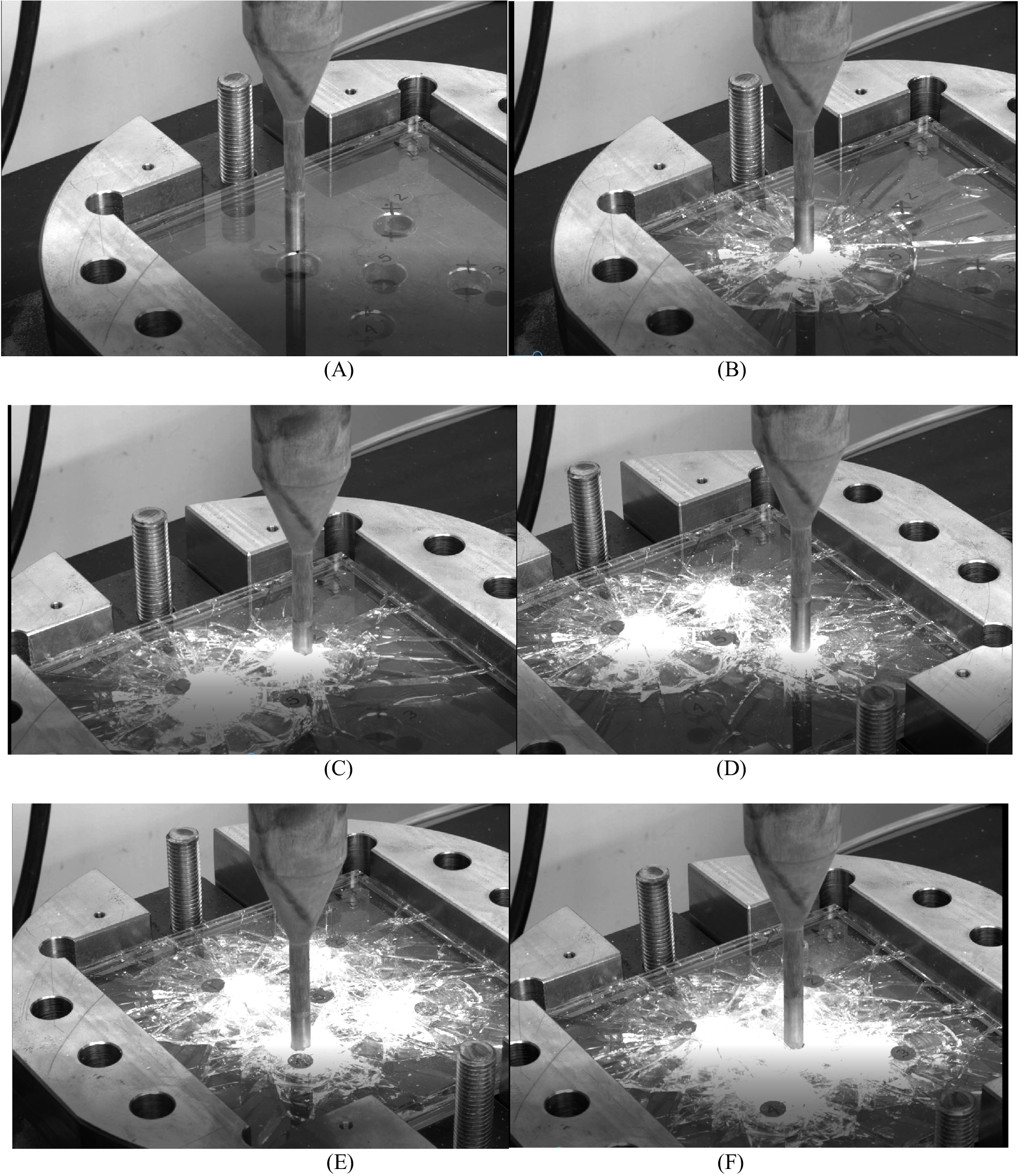 Damage propagation in the transparent armor in QS multi-punching test using SPR = 2 and L = 100 mm. A Moments before first punch B First punch damage C Second punch D Third punch E Fourth punch F Fifth punch