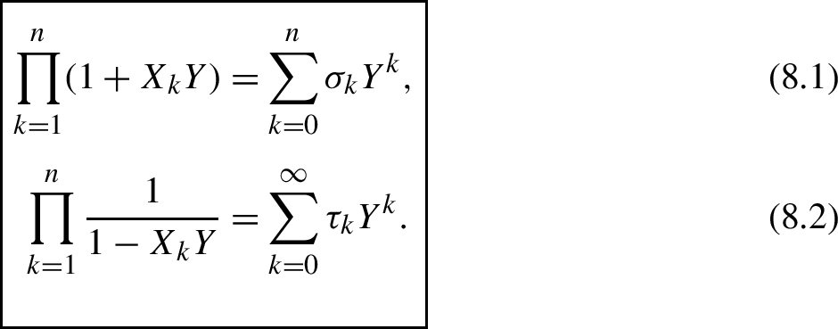 $$\begin{aligned} (1+X)^{n}&=\sum _{I\subseteq N}X^{|I|}=\sum _{k=0}^{n}\binom{n}{k}X^{k}, \\ (1-X)^{-n}&=\sum _{k_{1},\ldots ,k_{n}\ge 0}X^{k_{1}+\cdots +k_{n}}= \sum _{k=0}^{\infty}\binom{n+k-1}{k}X^{k}, \end{aligned}$$