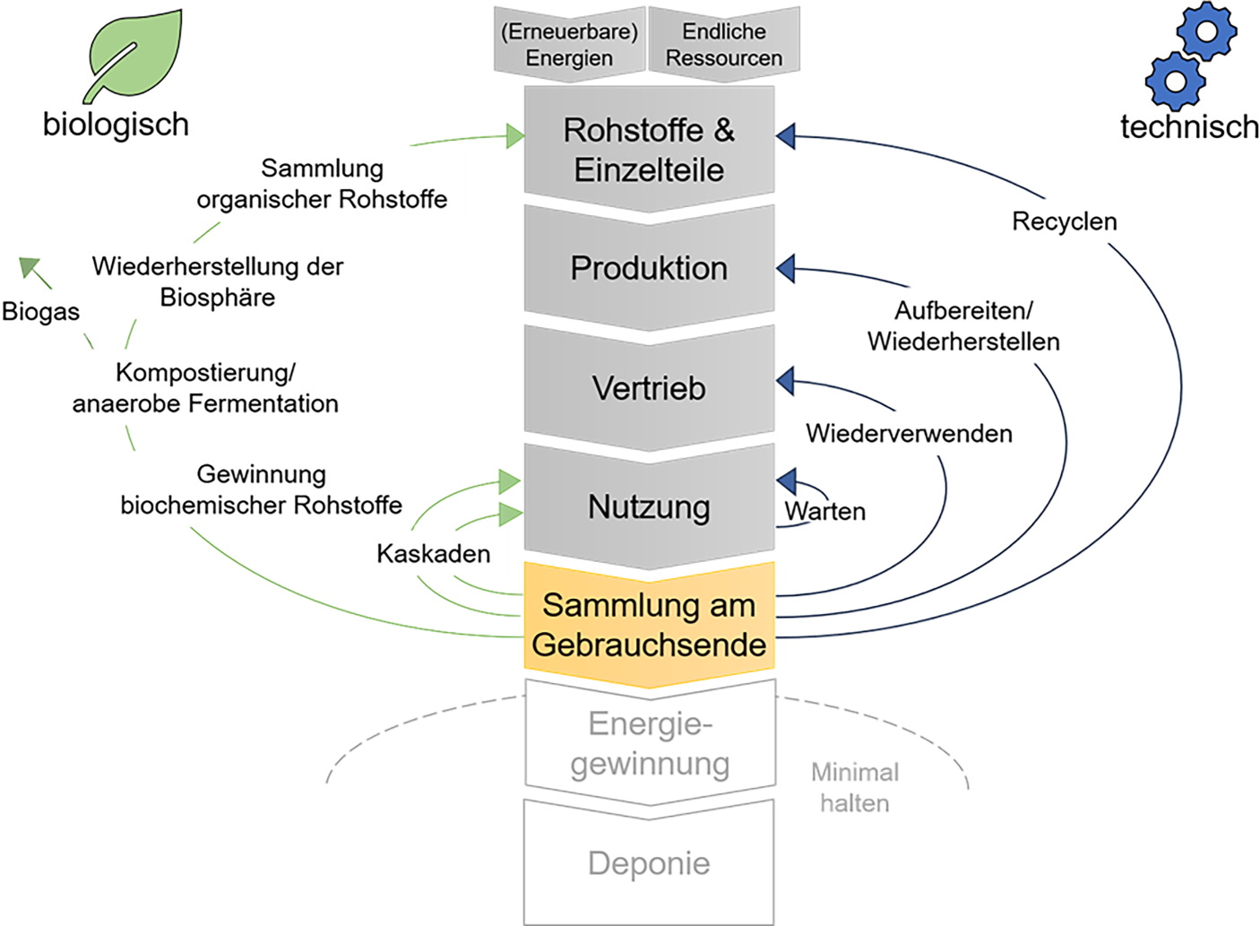 Die Kreislaufwirtschaft lässt sich definieren als „industrielles System, das durch seine Absicht und Gestaltung restaurativ oder regenerativ ist. Sie ersetzt das ‚End-of-Life‘-Konzept durch Wiederherstellung, verlagert den Fokus auf die Nutzung erneuerbarer Energien, eliminiert die Verwendung giftiger Chemikalien […] und zielt auf die Beseitigung von Abfällen durch überlegene Gestaltung von Materialien, Produkten, Systemen und […] Geschäftsmodellen“ (Ellen MacArthur Foundation 2013). Die verschiedenen Kreislaufprinzipien, die entweder einem biologischen oder einem technischen Zyklus folgen, sind in Abb. 1 dargestellt.