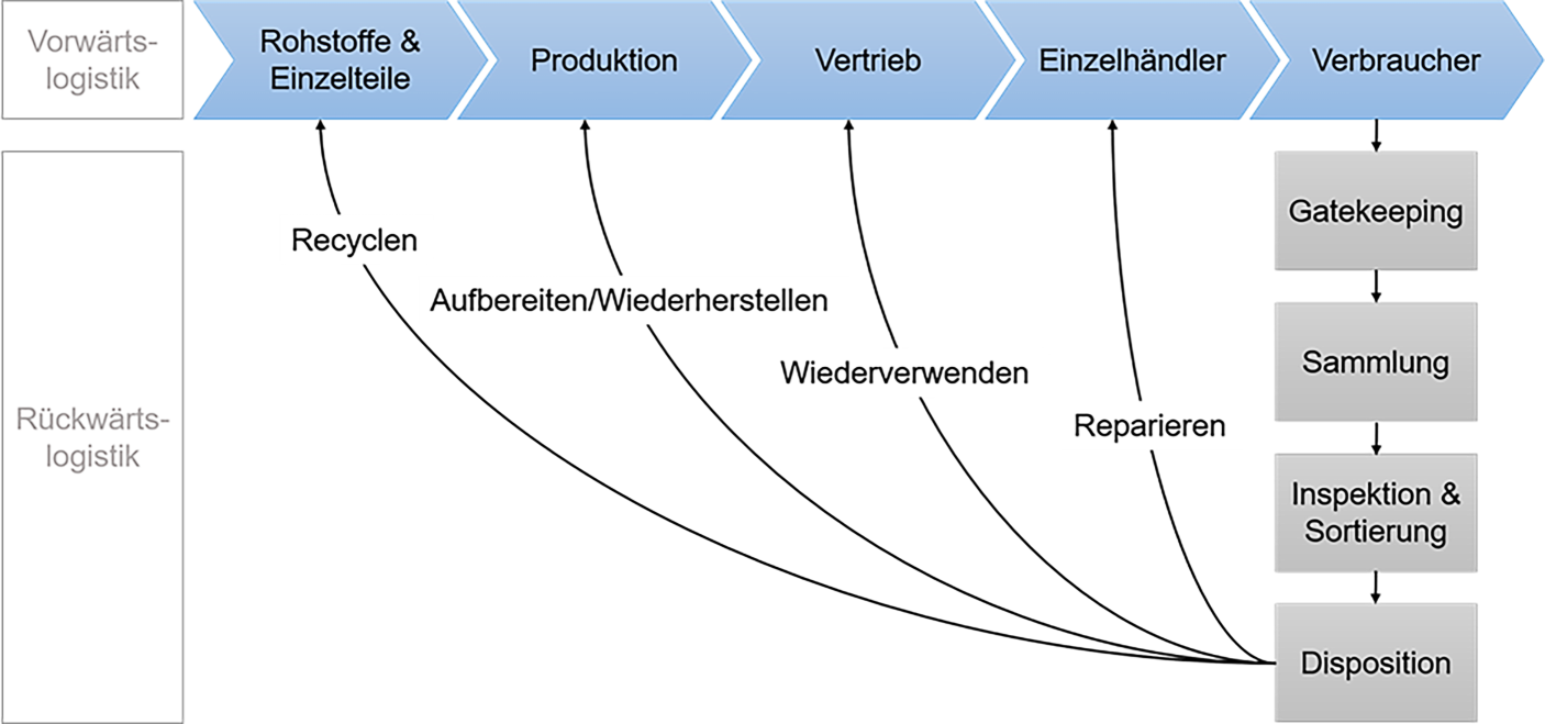 Die Kreislaufwirtschaft kann in zwei wesentliche Stufen unterteilt werden. Die erste Stufe umfasst die Zirkulation von Produkten durch Wiederverkauf, Reparatur und Weiterverwendung. Dies schafft jedoch keinen vollständigen Kreislauf. Die zweite Stufe fokussiert sich auf die Wiederverwendung von Materialien gebrauchter Produkte ohne Wertverlust, was als die eigentliche Verwirklichung der Kreislaufwirtschaft angesehen wird. Um diese Stufen zu erreichen und die Wertschöpfung kreislauffähig auszurichten, ist es essenziell die Lieferkette zu schließen. Dafür müssen die meisten produzierenden Unternehmen die traditionelle Vorwärtslogistik erweitern und mit der Rückwärtslogistik verknüpfen (Govindan und Soleimani 2017).