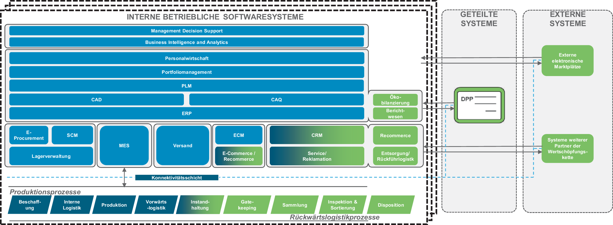 Einen entscheidenden Beitrag zur Herstellung der Informationsflüsse kann außerdem der DPP leisten. Obwohl der DPP ebenfalls wie die anderen externen Systeme integriert werden muss, ist er ein Datensatz, der „by design“ für die Versorgung mit relevanten Informationen optimiert ist. Der DPP kann als zentrale Datenquelle für alle zuvor beschriebenen Systeme fungieren und die Datenbasis eines Take-Back Systems maßgeblich bestimmen. Zudem wird erwartet, dass der DPP für die im Nachhaltigkeitskontext relevanten Prozesse der Ökobilanzierung und der Nachhaltigkeitsberichterstattung von Bedeutung sein wird und entsprechende Systeme zur Berichterstattung (z. B. PCF oder CCF) oder Ökobilanzierung (z. B. Life Cycle Assessment) mit relevanten Daten versorgt.