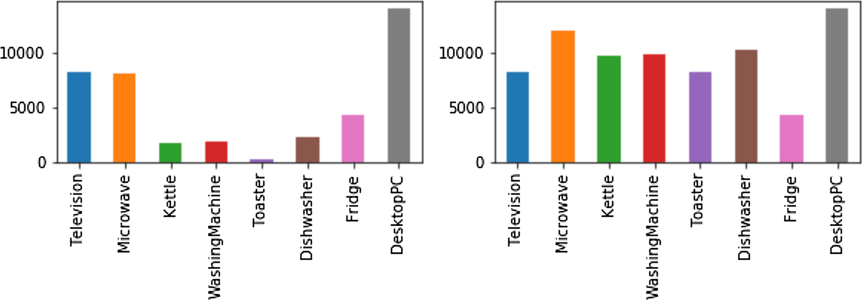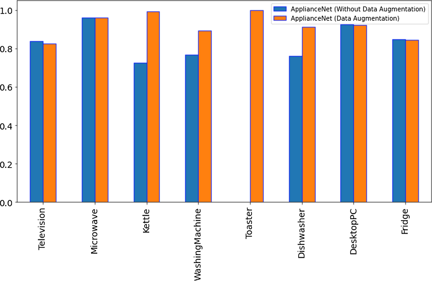 Figure 10 presents the obtained individual appliance accuracy. It confirms data augmentation produces accurate results for minor classes. In the case of ‘Toaster’, it does not recognize any usage, while in the case of data augmentation, it is fully recognized. The augmentation assists the model to learn the signature of the appliance.