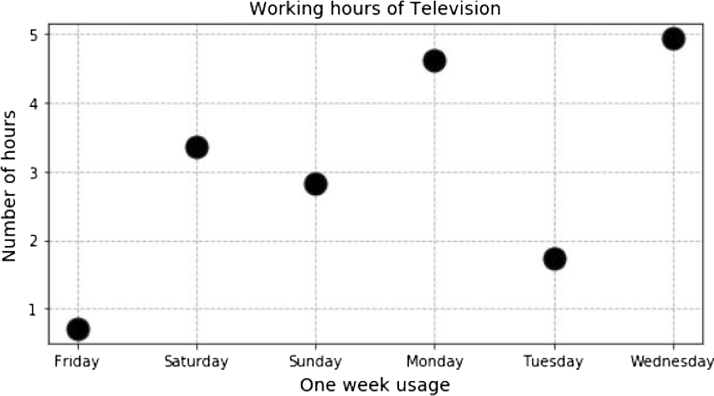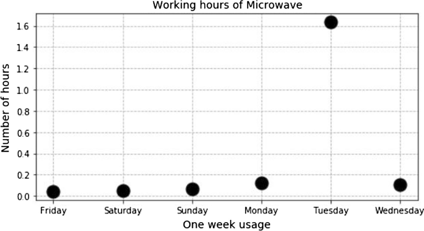 We also presented the weekly usage of home appliances, which can be related to resident behavior. In Fig. 11, the number of hours is presented to watch the television. This pattern can be extended to months. It may have an indicator to see the sedentary pattern of the resident. The one-week behavior has two peeks more than four houses to watch the television, while Friday has the least time to watch it. In Fig. 12, we can observe on Friday there is no usage of the microwave. This pattern is the same for Saturday as well. It may possible to dine out or skip the meal. To extend this work, we can confirm with the user about such situations. However, ‘Toaster’ is recognized on Friday as shown in Fig. 13. This home appliance can provide the eating pattern of the resident that may help the individual or practitioner to analyze the daily routines of the resident. In Fig. 14, the usage pattern is found on Friday, Saturday, Sunday, and Wednesday. This washing machine usage pattern is frequent and may help to diagnose complications by practitioners or healthcare givers. Such information can also be useful for energy providers as well as residents to use the washing machine in an optimal way. Consequently, it can help to reduce energy consumption.
