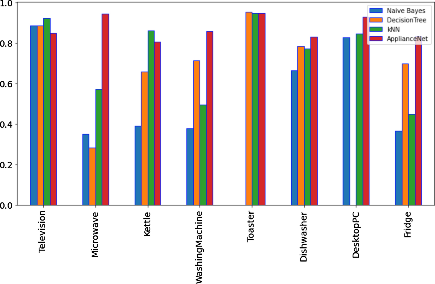 In Fig. 15, it is clear that the proposed ApplianceNet performs better in most of the cases. Our model obtained the best results in the case of ‘Microwave’, ‘Kettle’, ‘Toaster’, and ‘Diswasher’ where state-of-the-art models have more confusion to recognize these appliances.