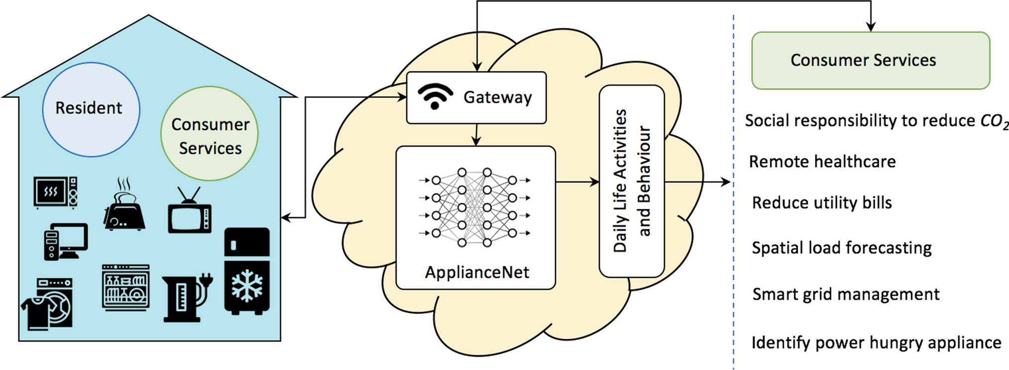 In our research, IAM-based solution is considered as an effective and seamless way to monitor the activities of daily living and behavior. With the help of smart plugs, we monitor basic household appliances, such as toaster, microwave, fridge, washing machine, etc. To distinguish the type of meal (i.e., breakfast, lunch, or dinner), the time information is available in collected data streams. The data stream of smart plugs contains two columns; one is a timestamp and the second is electric power consumption in watts. The task of recognizing home appliances is very challenging because most energy consumption patterns of appliances overlap with other appliances. It makes an unnoticeable difference in readings. The proposed ApplianceNet framework (see block diagram in Fig. 1) processes time-series data by extracting features to a representable form and recognizes non-linearly separable home appliances by a feed-forward neural network. Our contributions in this research are as follows.