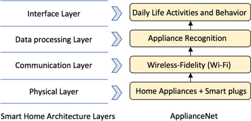 The design of our proposed framework is based on the standard layered architecture used in a smart home. The inspired architecture of ApplianceNet alongside the standard architecture of a smart home is illustrated in Fig. 2.
